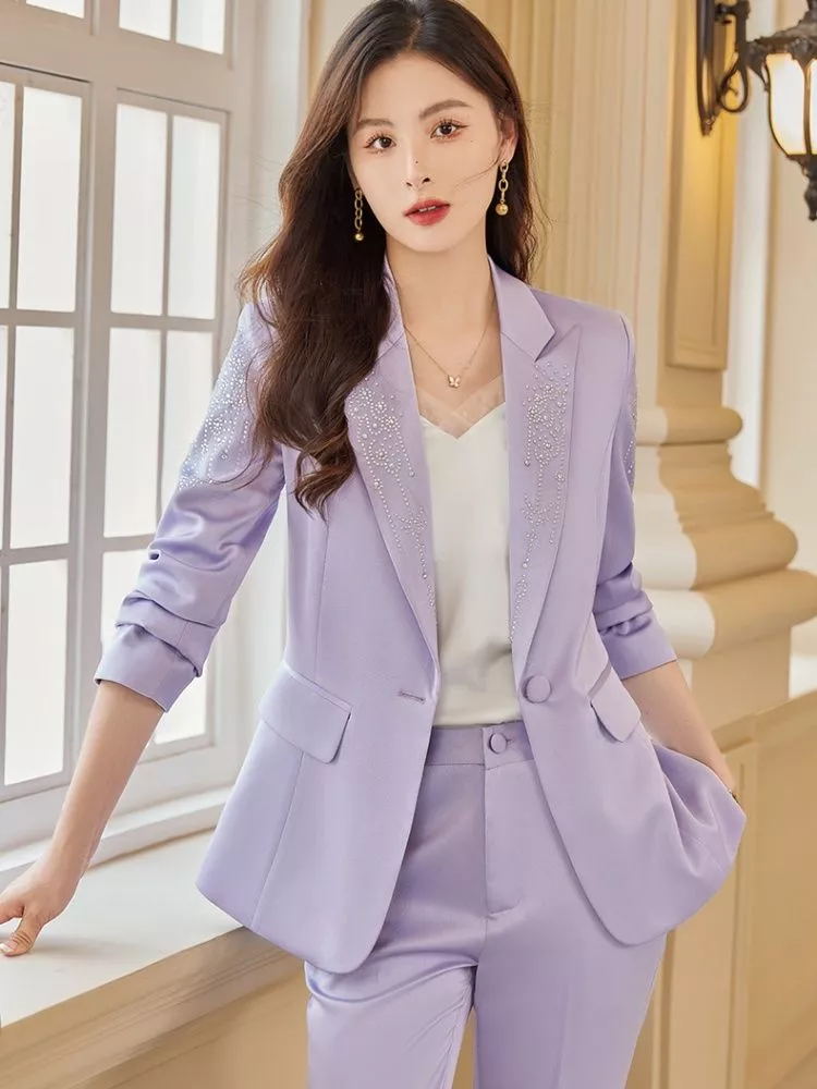 Completo Donna Viola Elegante Giacca Sagomata E Pantalone Slim Raffinato CF61818