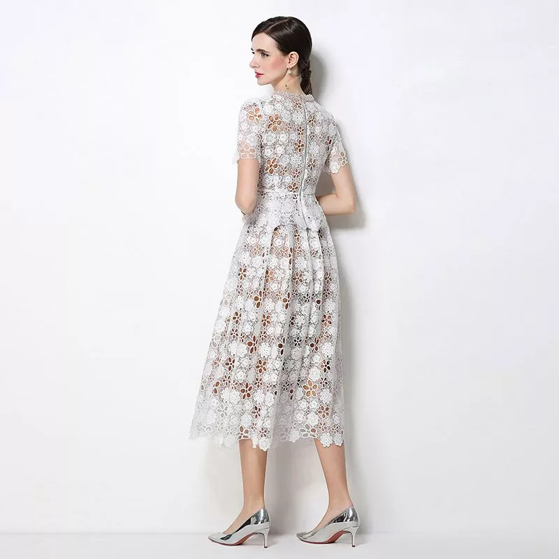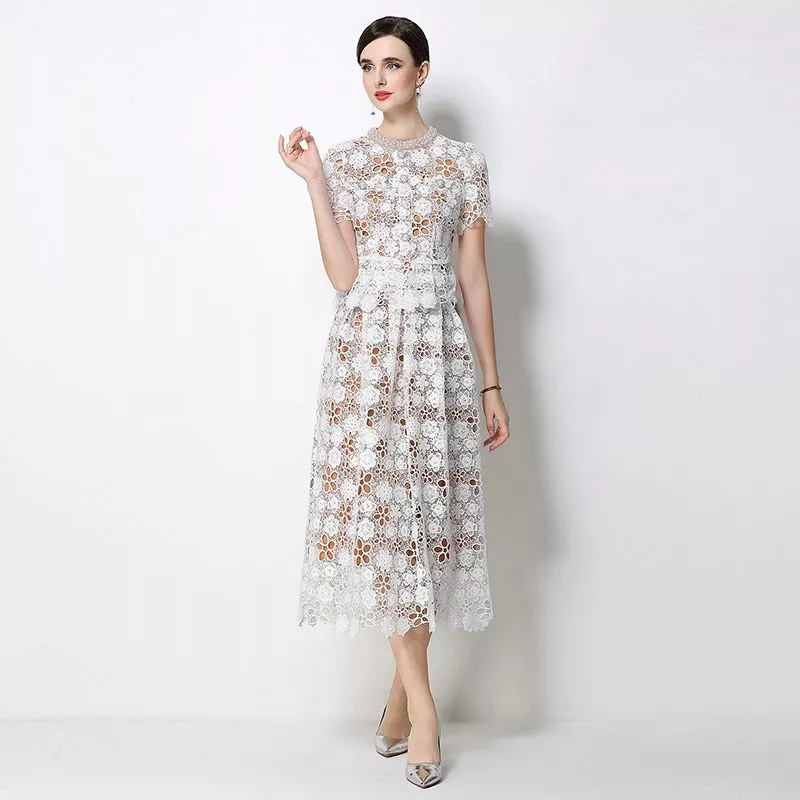 Completo da donna composto da top e gonna in pizzo bianco con lavorazione floreale traforata, ideale per cerimonie ed eventi eleganti. Il set due pezzi unisce raffinatezza e versatilità, permettendo di creare look coordinati o separati.