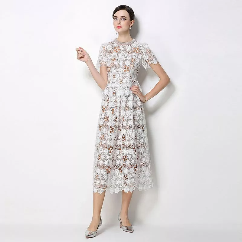 Il top strutturato valorizza la parte superiore con una linea pulita, mentre la gonna midi svasata dona movimento e leggerezza. Il pizzo lavorato conferisce un aspetto ricercato e luminoso, perfetto per occasioni formali e contesti eleganti.