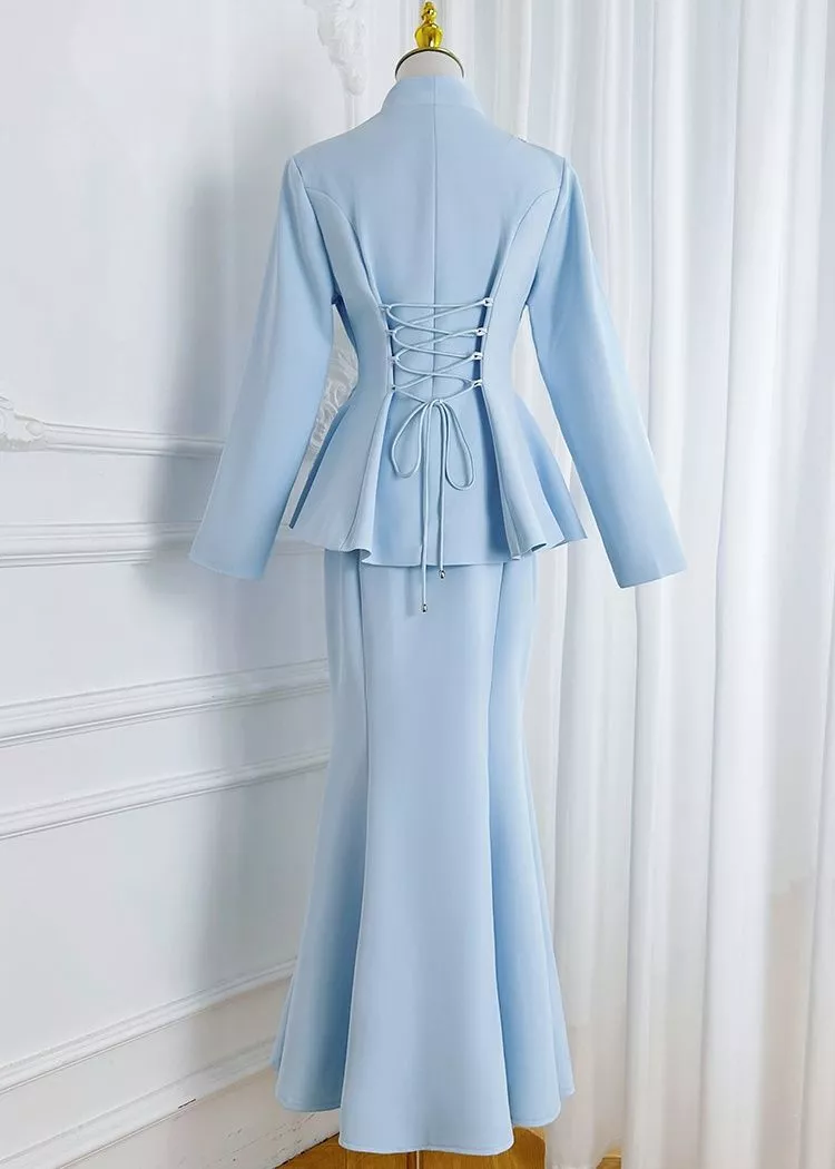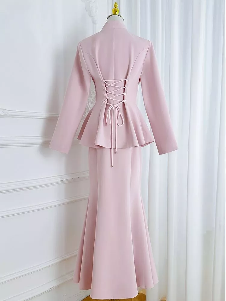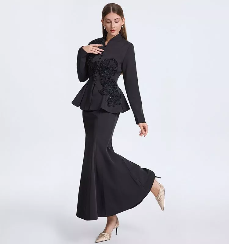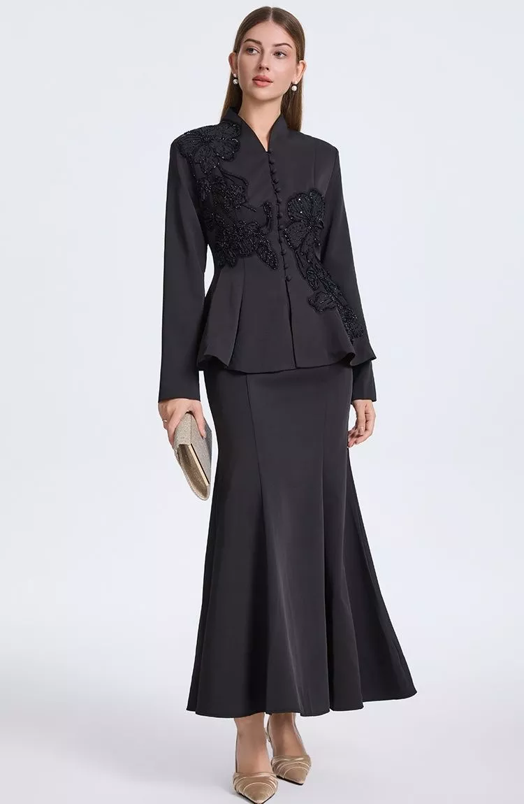 Completo donna elegante composto da giacca strutturata e gonna lunga a linea sirena, pensato per occasioni formali e cerimonie. La giacca presenta applicazioni decorative che valorizzano il design, mentre la gonna aderente slancia la figura creando un effetto raffinato e femminile. Il dettaglio con allacciatura posteriore permette di adattare la vestibilità, esaltando la silhouette con un tocco sartoriale. Un outfit sofisticato ideale per eventi eleganti e look ricercati.