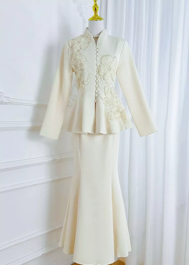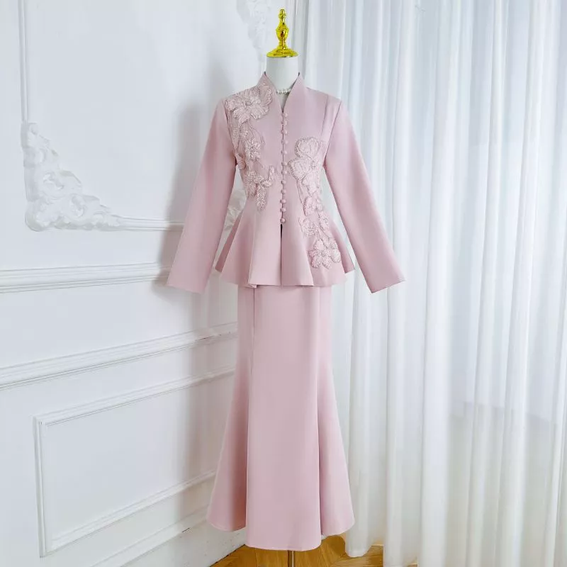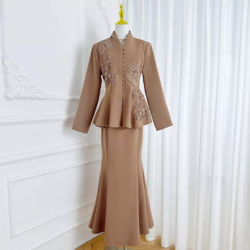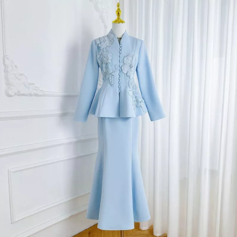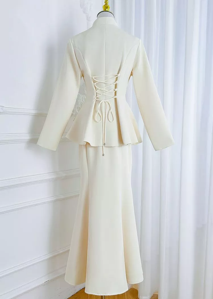 Completo donna elegante composto da giacca strutturata e gonna lunga a linea sirena, pensato per occasioni formali e cerimonie. La giacca presenta applicazioni decorative che valorizzano il design, mentre la gonna aderente slancia la figura creando un effetto raffinato e femminile. Il dettaglio con allacciatura posteriore permette di adattare la vestibilità, esaltando la silhouette con un tocco sartoriale. Un outfit sofisticato ideale per eventi eleganti e look ricercati.