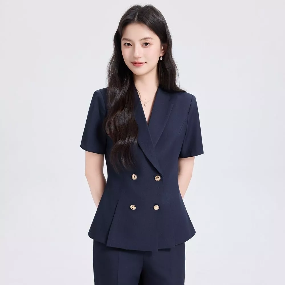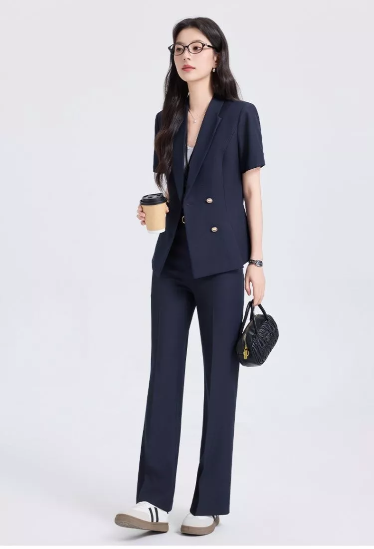 Completo donna elegante composto da giacca doppiopetto con manica corta e pantalone coordinato dal taglio moderno e professionale. Il design sartoriale valorizza la silhouette e rende questo tailleur perfetto per ambienti lavorativi, meeting e occasioni formali.