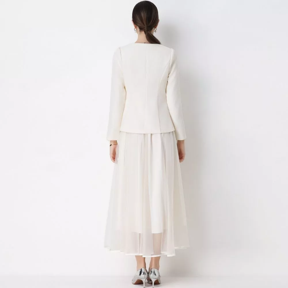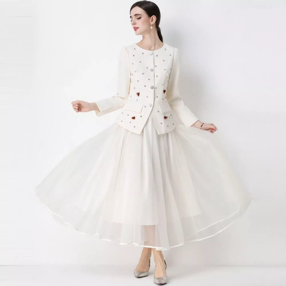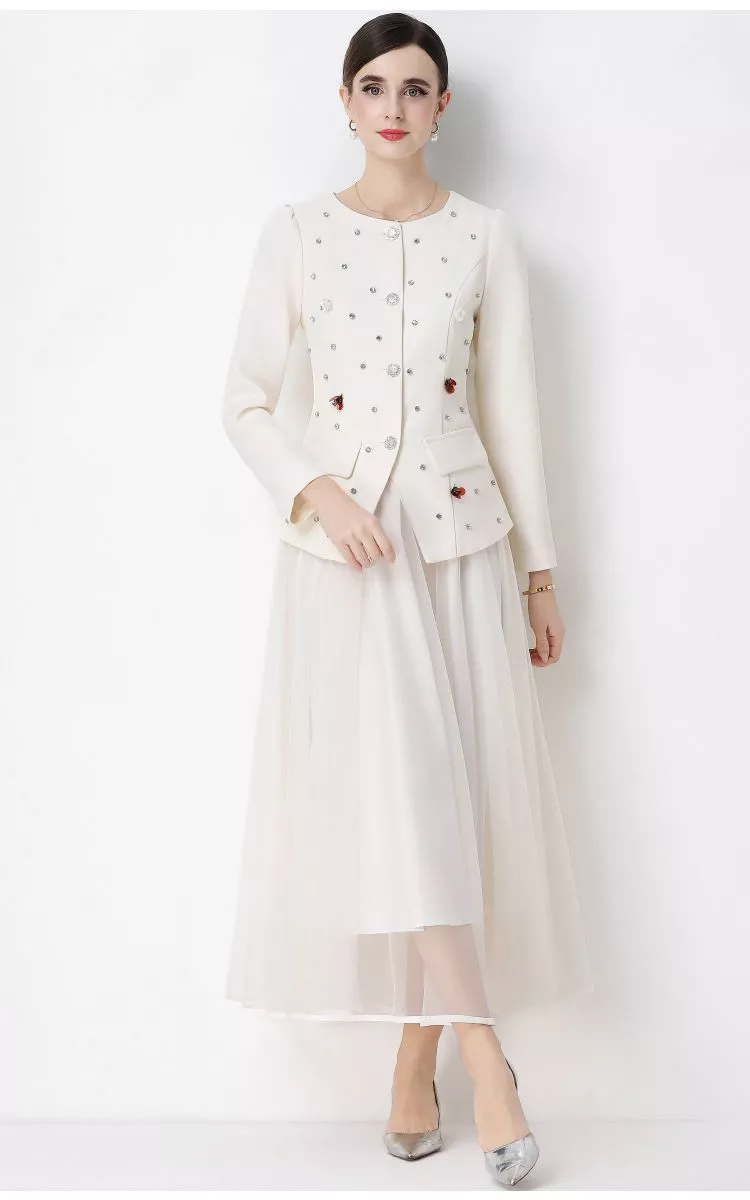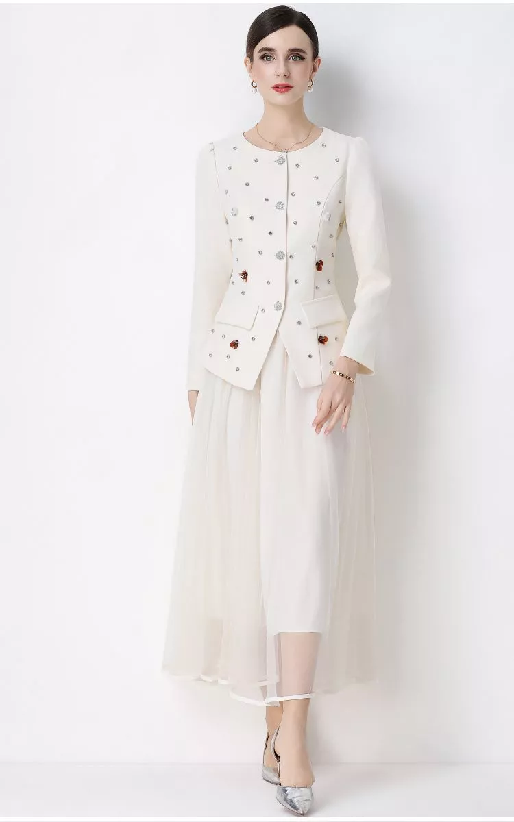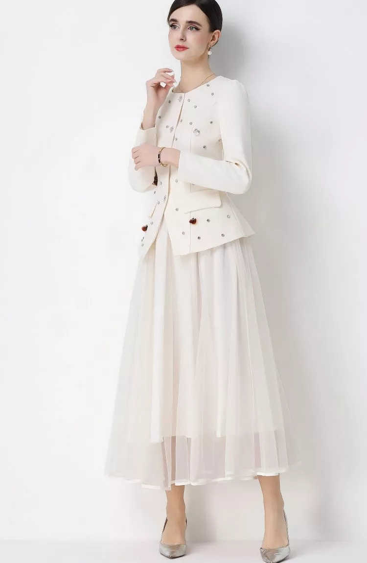 Completo Elegante Giacca Gioiello E Gonna Tulle Midi Avorio Bianco CF66220