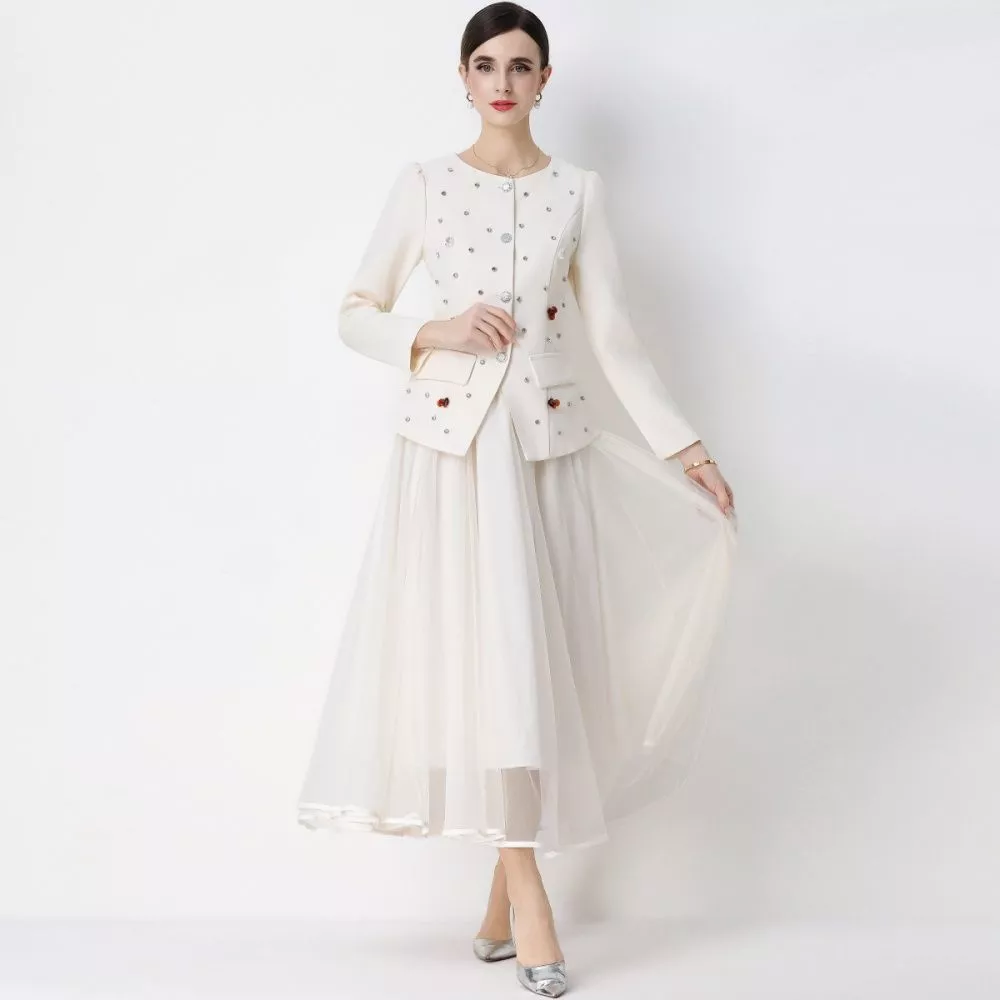 Completo elegante due pezzi composto da giacca decorata con dettagli gioiello e gonna midi in tulle leggero, ideale per cerimonie, eventi e occasioni speciali. La giacca strutturata valorizza la silhouette con una linea raffinata e femminile, mentre la gonna ampia dona movimento e leggerezza creando un outfit sofisticato e scenografico perfetto per invitata e eventi eleganti.