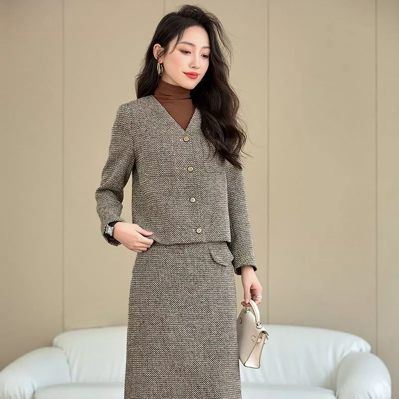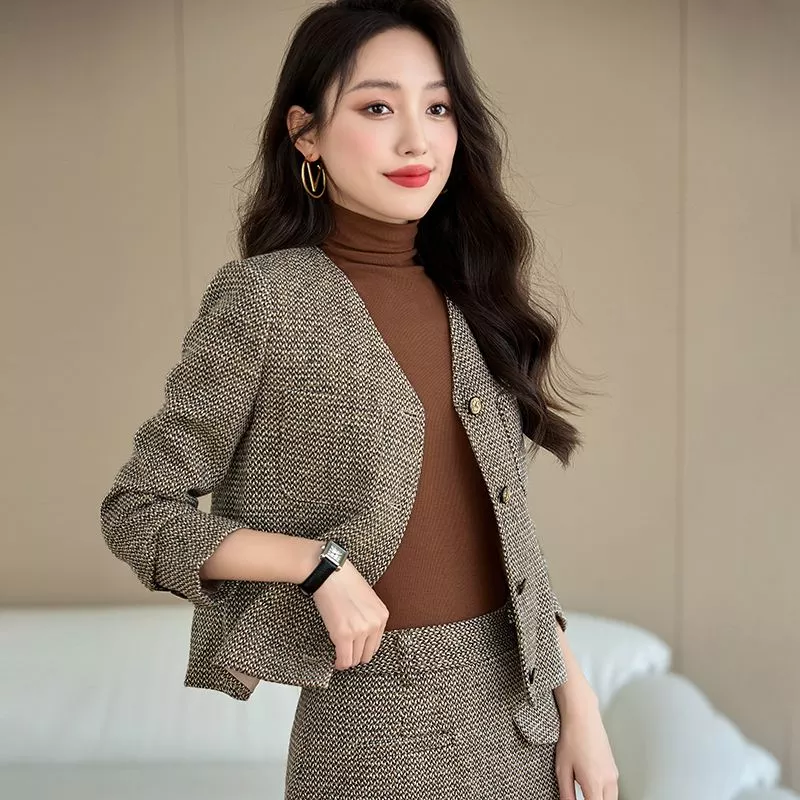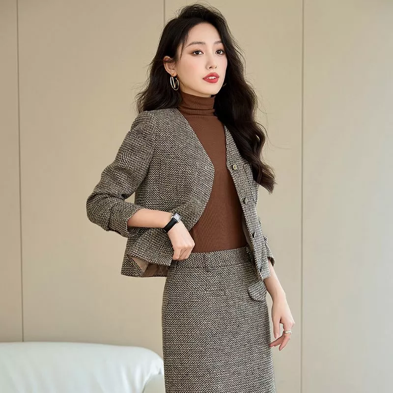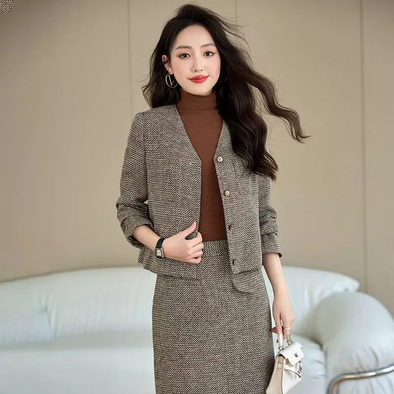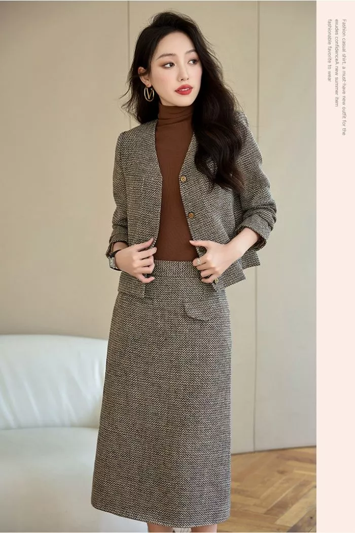 Un completo raffinato pensato per creare un look elegante e curato, ideale per l'ufficio e per tutte le occasioni in cui serve uno stile formale ma moderno. La giacca corta valorizza la linea delle spalle e dona un effetto slanciato, mentre la gonna midi segue armoniosamente le forme offrendo un profilo bon ton e femminile. Il colore marrone, caldo ed equilibrato, è una tonalità molto ricercata nelle palette moda attuali e si abbina facilmente a top chiari e accessori neutri.