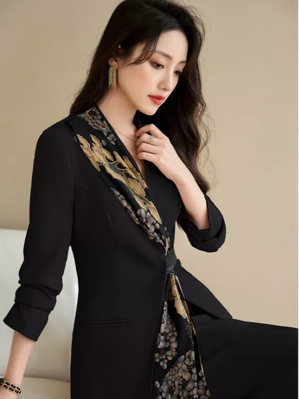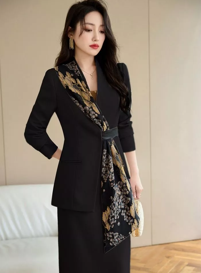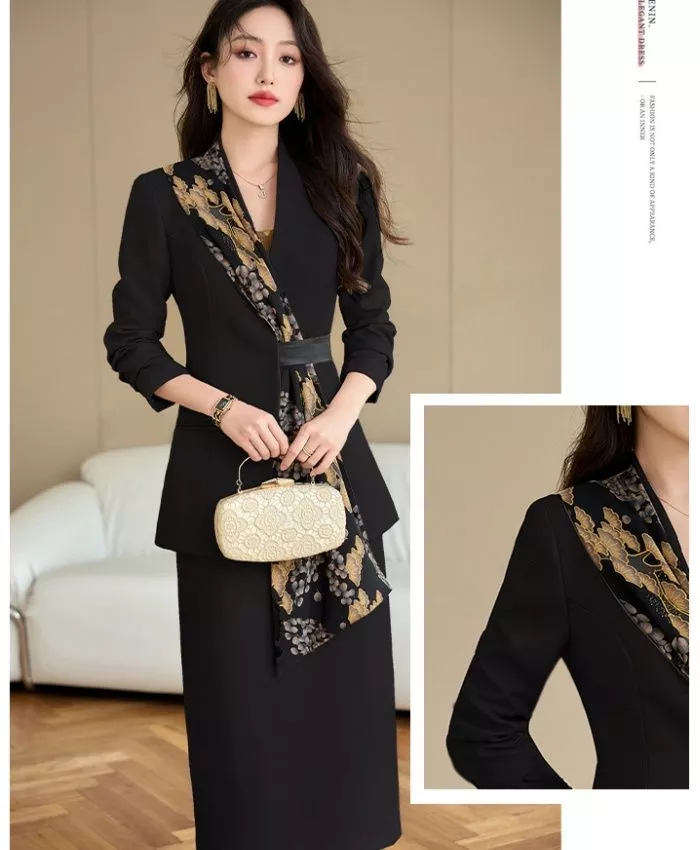 Completo Elegante Nero Giacca Con Dettaglio Stampato E Gonna Midi Chic CF58149