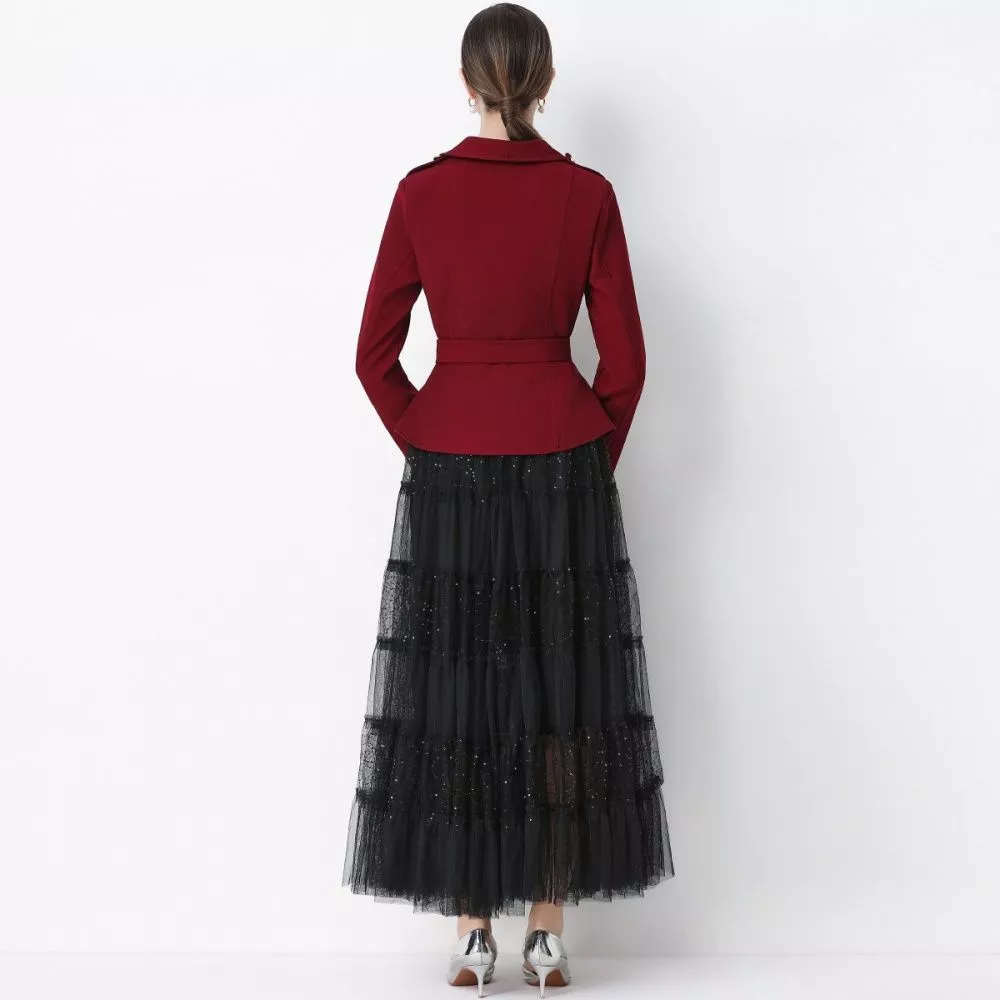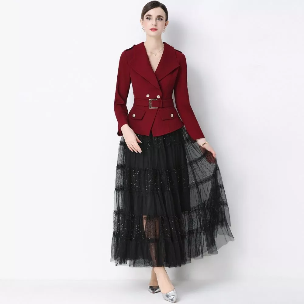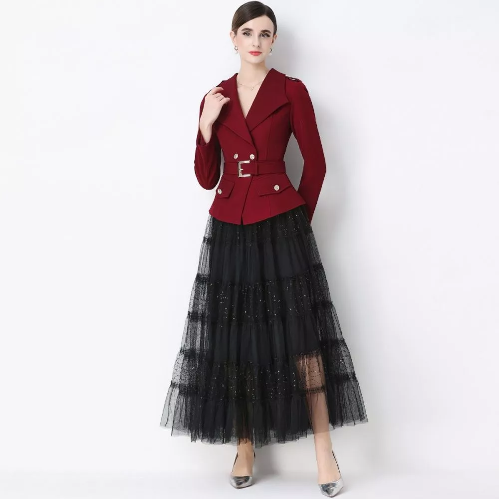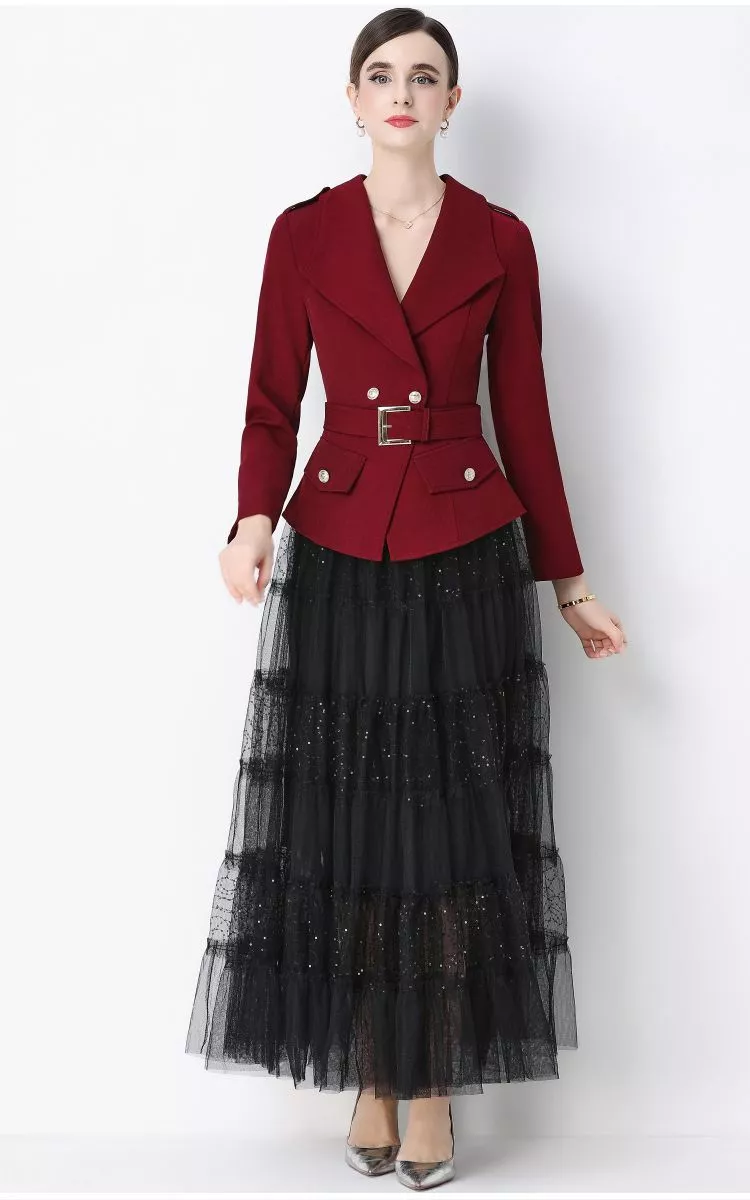 Completo elegante composto da giacca strutturata con cintura e gonna lunga in tulle, pensato per cerimonie, eventi e occasioni speciali. Il contrasto tra la giacca rosso vino dal taglio sartoriale e la gonna vaporosa crea un look raffinato, femminile e scenografico. Un outfit coordinato che valorizza la silhouette e garantisce una presenza sofisticata e ricercata.