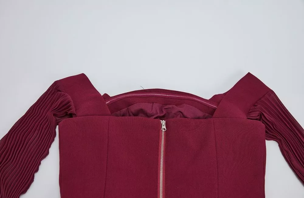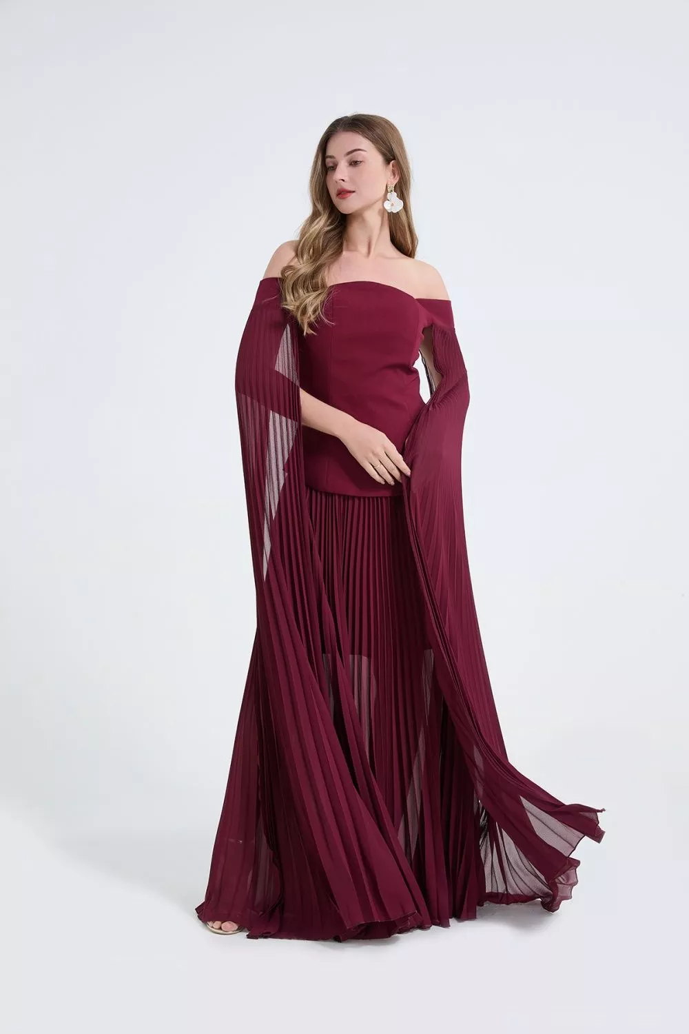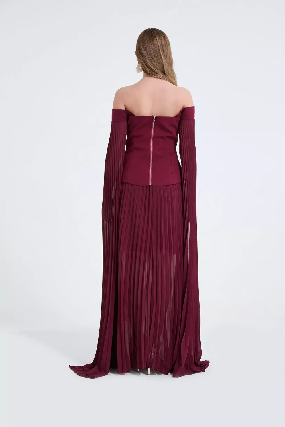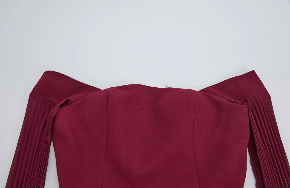 Completo Elegante Rosso Vino Top Bardot Gonna Lunga Plissé Evento CF67031