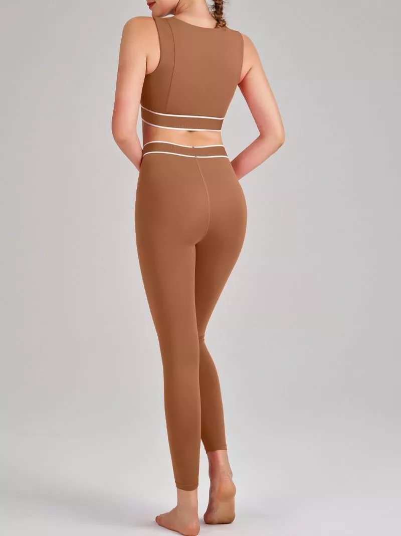 Il set include leggings a vita alta e top senza maniche con collo alto, realizzati in tessuto elasticizzato che aderisce al corpo offrendo stabilità e comfort durante il movimento.