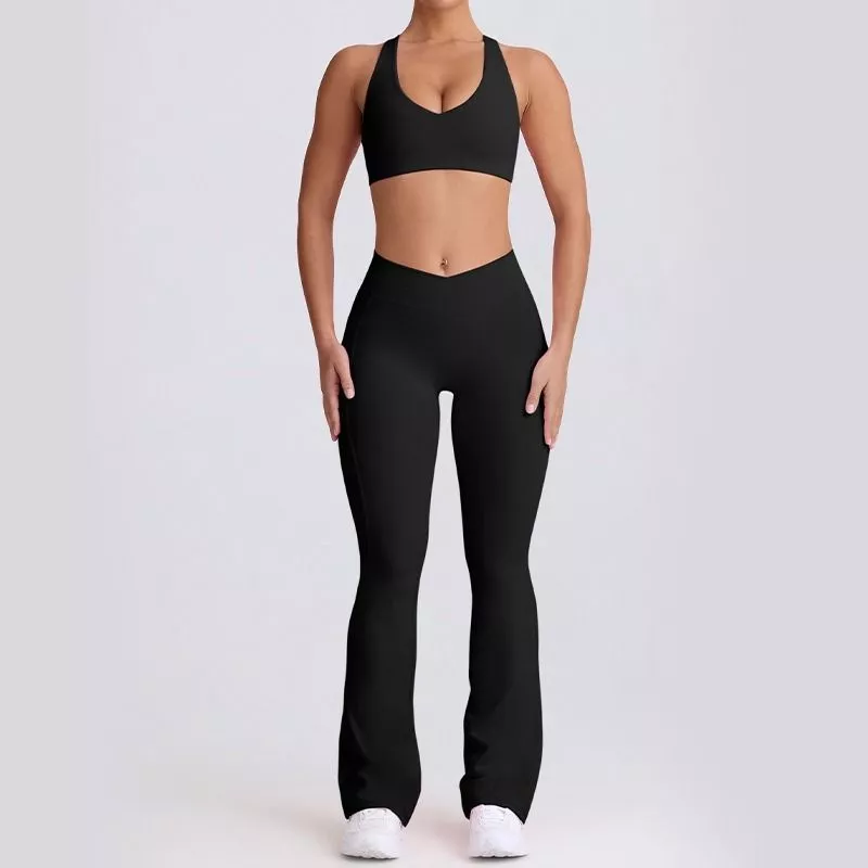 Il set include leggings svasati a vita alta e reggiseno sportivo con supporto medio, realizzati in tessuto elasticizzato che segue i movimenti del corpo senza costrizioni.
