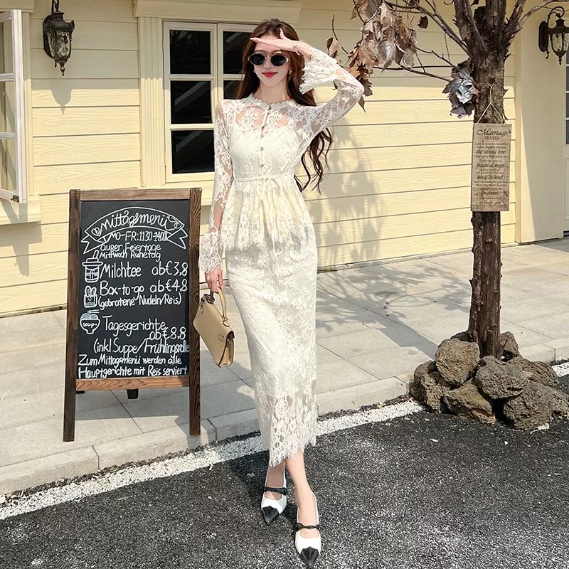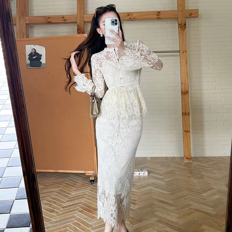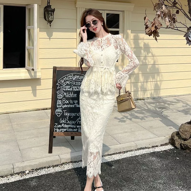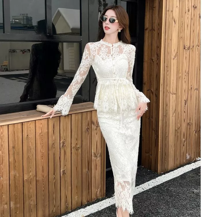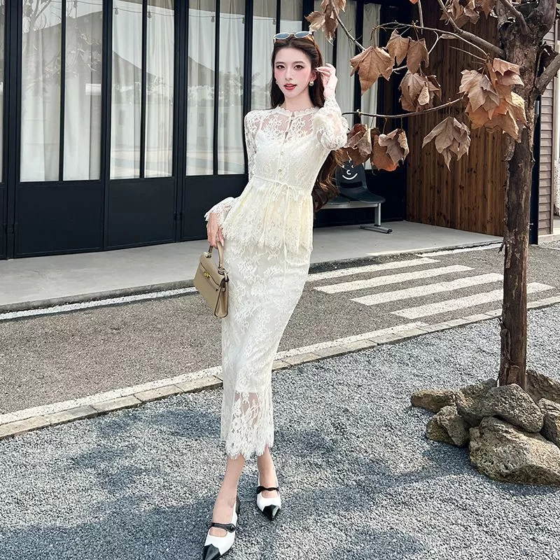 Completo In Pizzo Avorio Con Top A Maniche Lunghe E Gonna Longuette CF57835