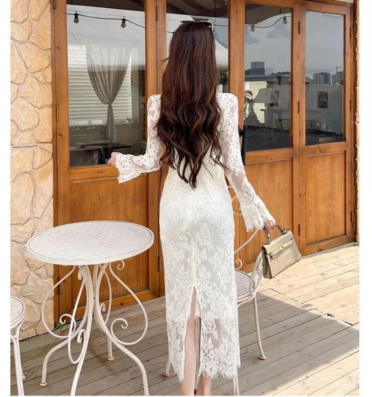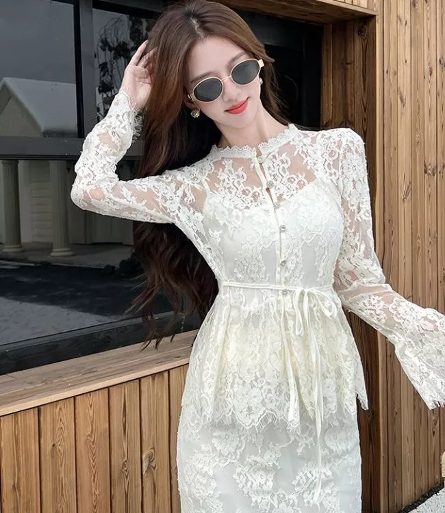 Completo in pizzo color avorio dallo stile romantico e raffinato, perfetto per cerimonie, eventi e occasioni speciali.