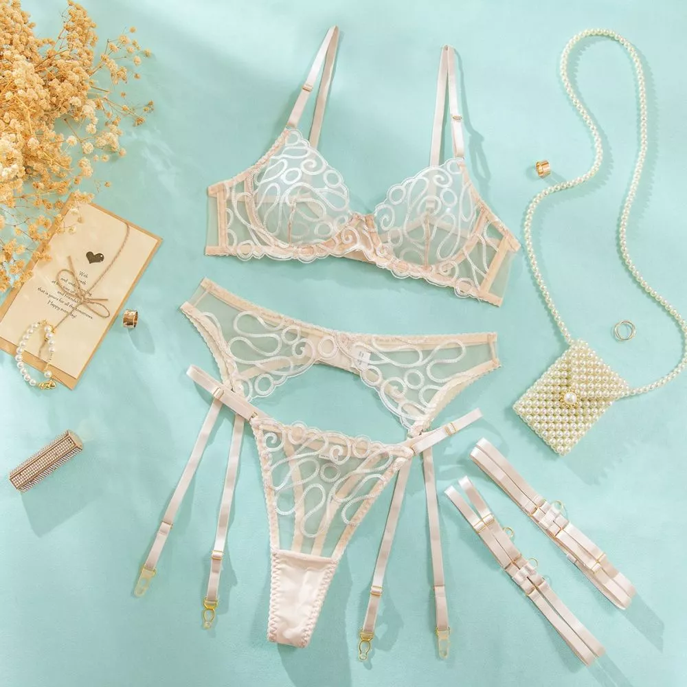 Completo Intimo Donna Albicocca Pizzo Trasparente Reggicalze Sexy T1026022650