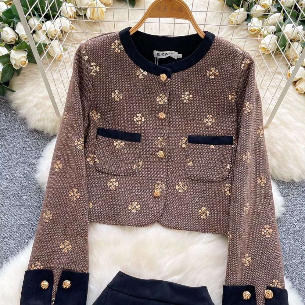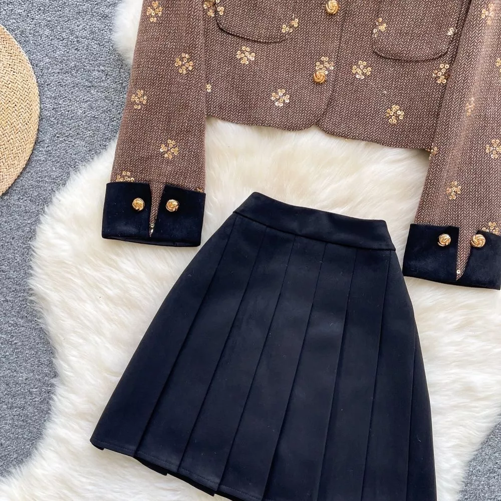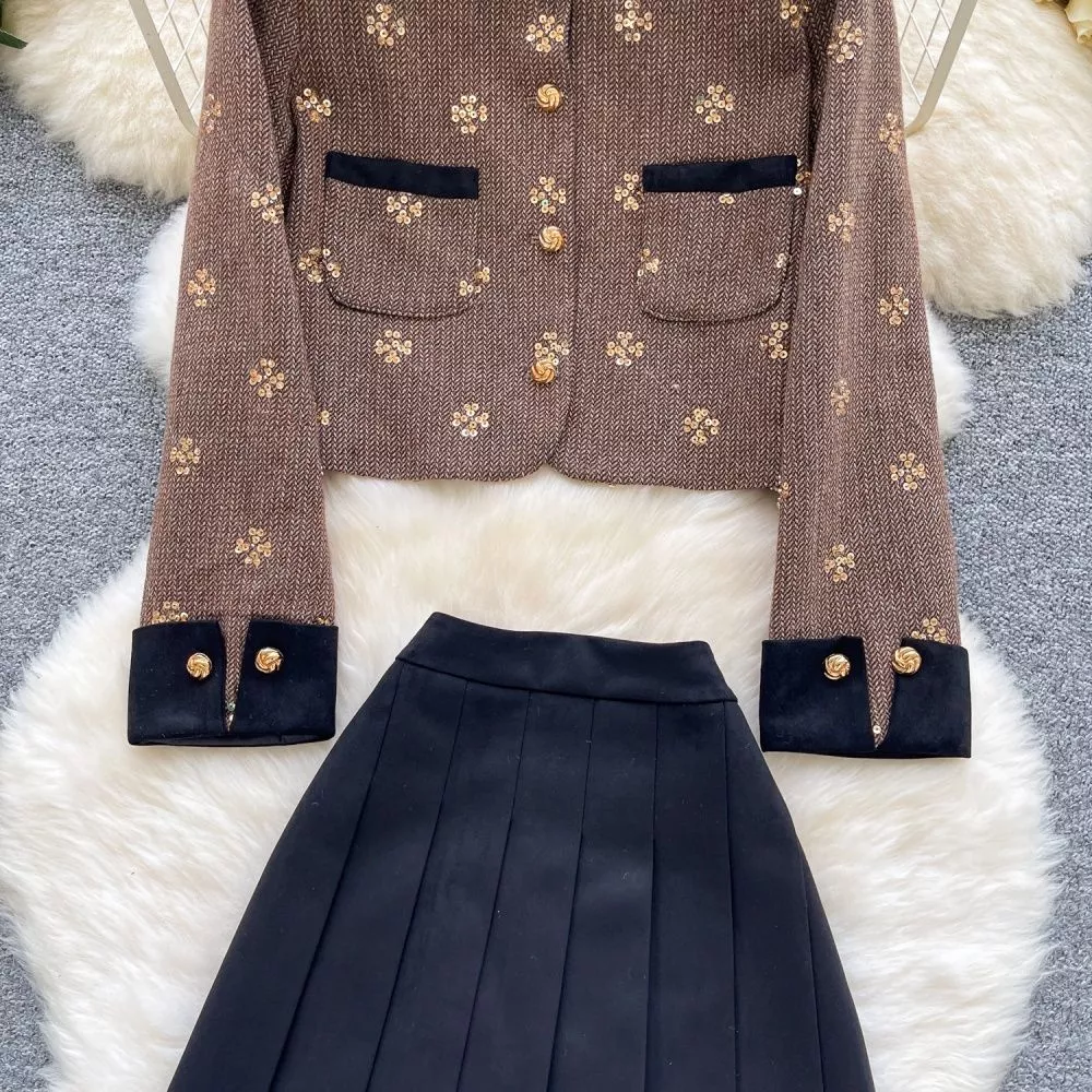 Completo Marrone Con Giacca Ricamata E Gonna Plissettata Elegante CF58016