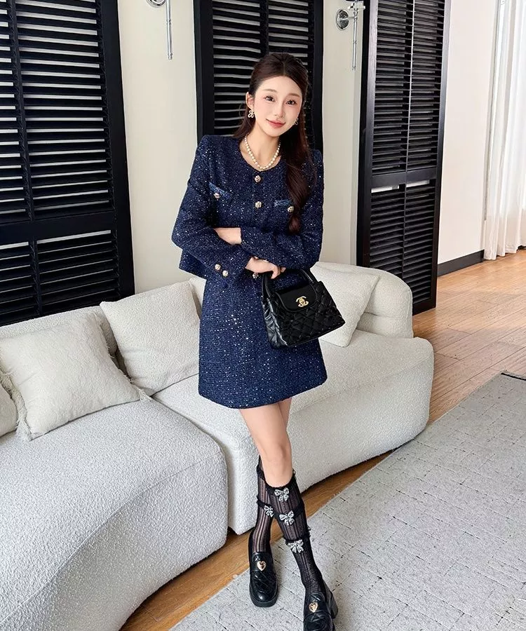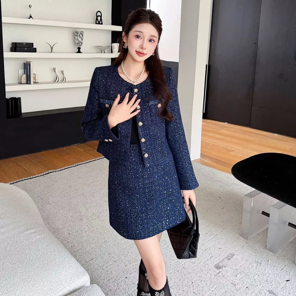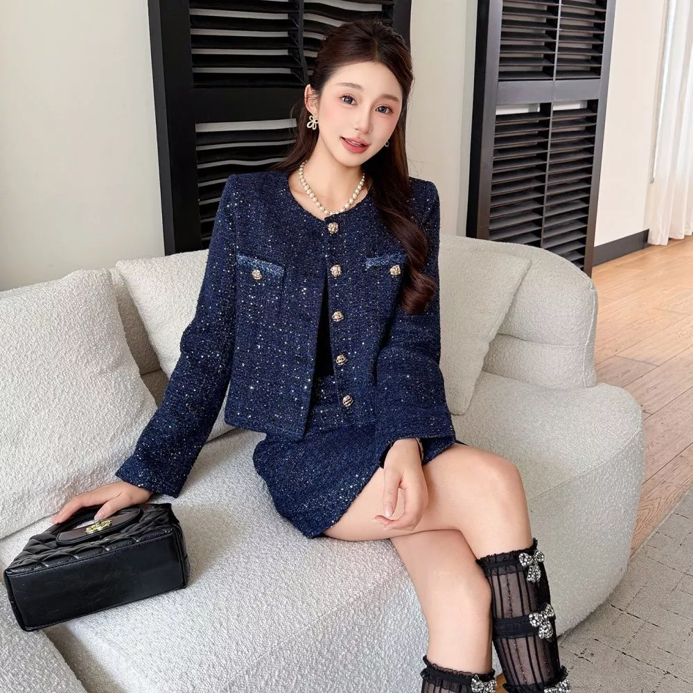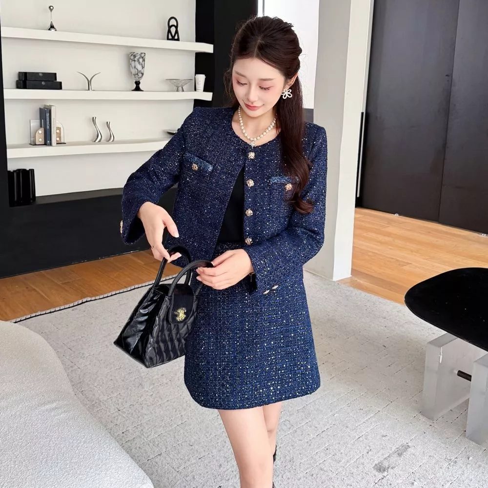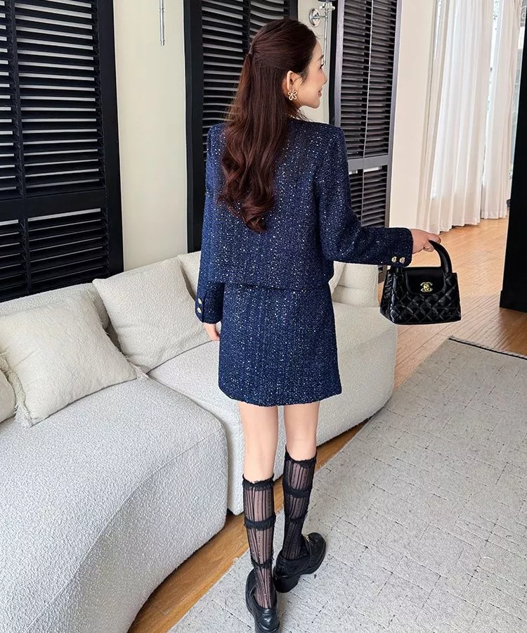 Un completo in tweed blu navy dallo stile elegante e moderno, composto da giacca strutturata con bottoni oro e gonna corta coordinata. La giacca, dal taglio pulito e raffinato, valorizza la figura grazie alla linea dritta e ai dettagli metallici che illuminano il look. La gonna, semplice e versatile, completa l’insieme con equilibrio rendendolo perfetto per un outfit curato e femminile.