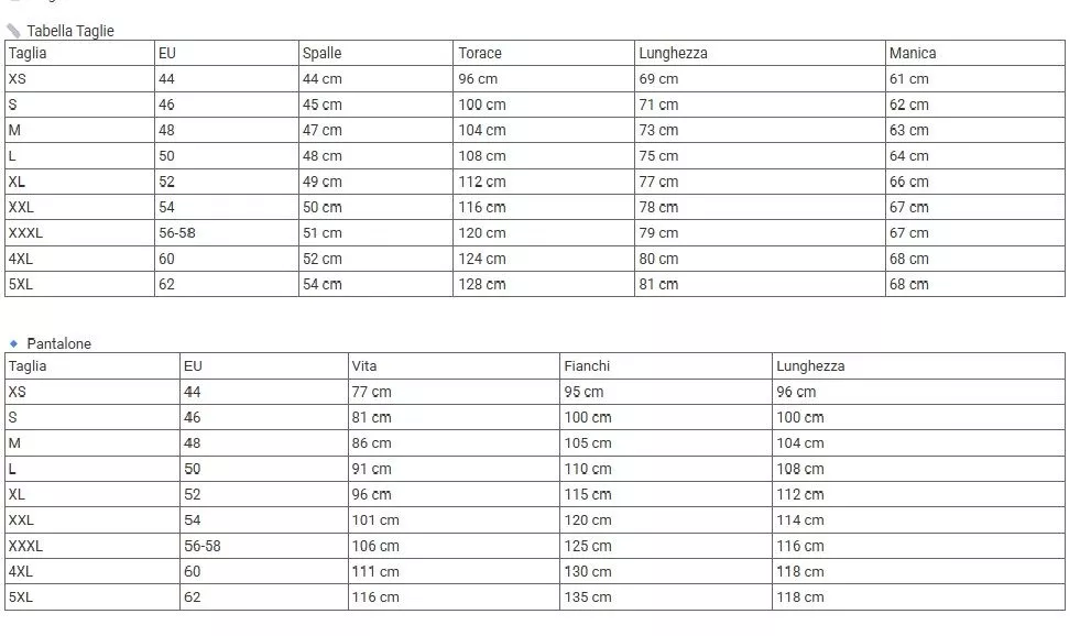 | Taglia | EU | Spalle | Torace | Lunghezza | Manica |