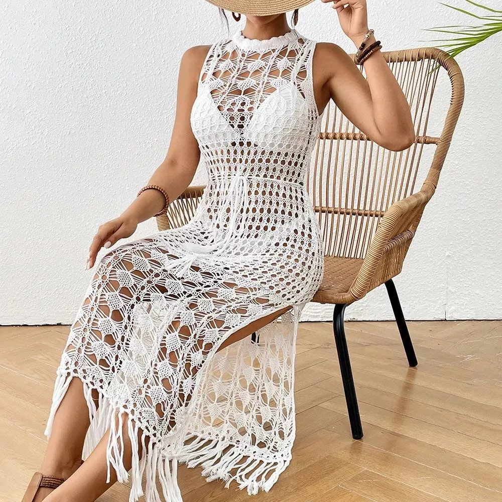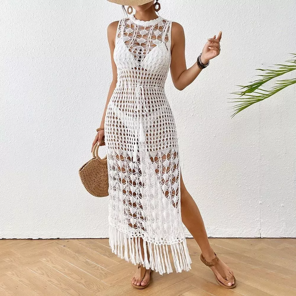 Questo copricostume lungo in maglia traforata bianca è l’essenza dello stile boho chic da spiaggia. Realizzato in tessuto sintetico lavorato a rete con motivo floreale, avvolge la silhouette con eleganza grazie alla vita regolabile con coulisse. Le frange sul fondo aggiungono movimento e un tocco etnico raffinato. Perfetto sopra al bikini per una passeggiata sul lungomare o un aperitivo al tramonto, è l’ideale per chi cerca un capo leggero ma d’effetto, in linea con i trend moda estate 2025.