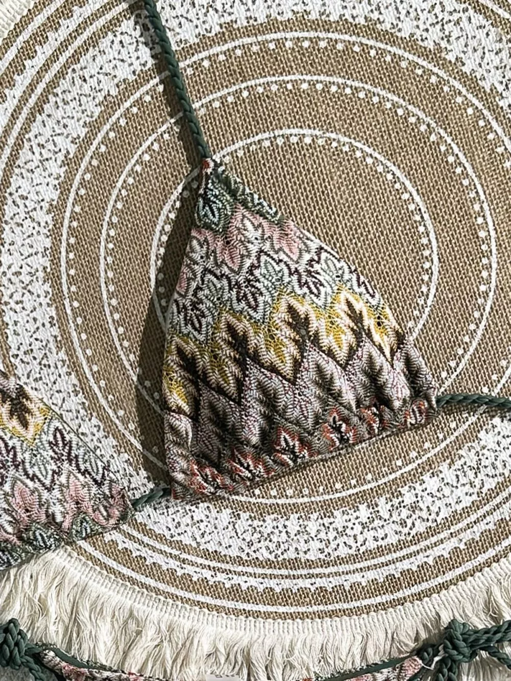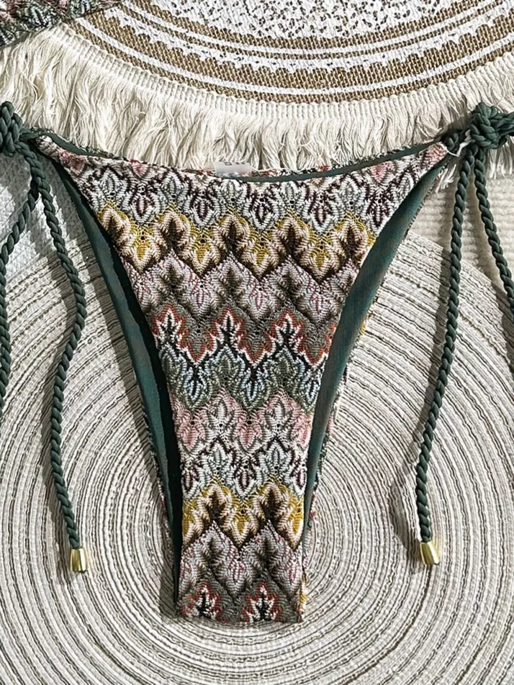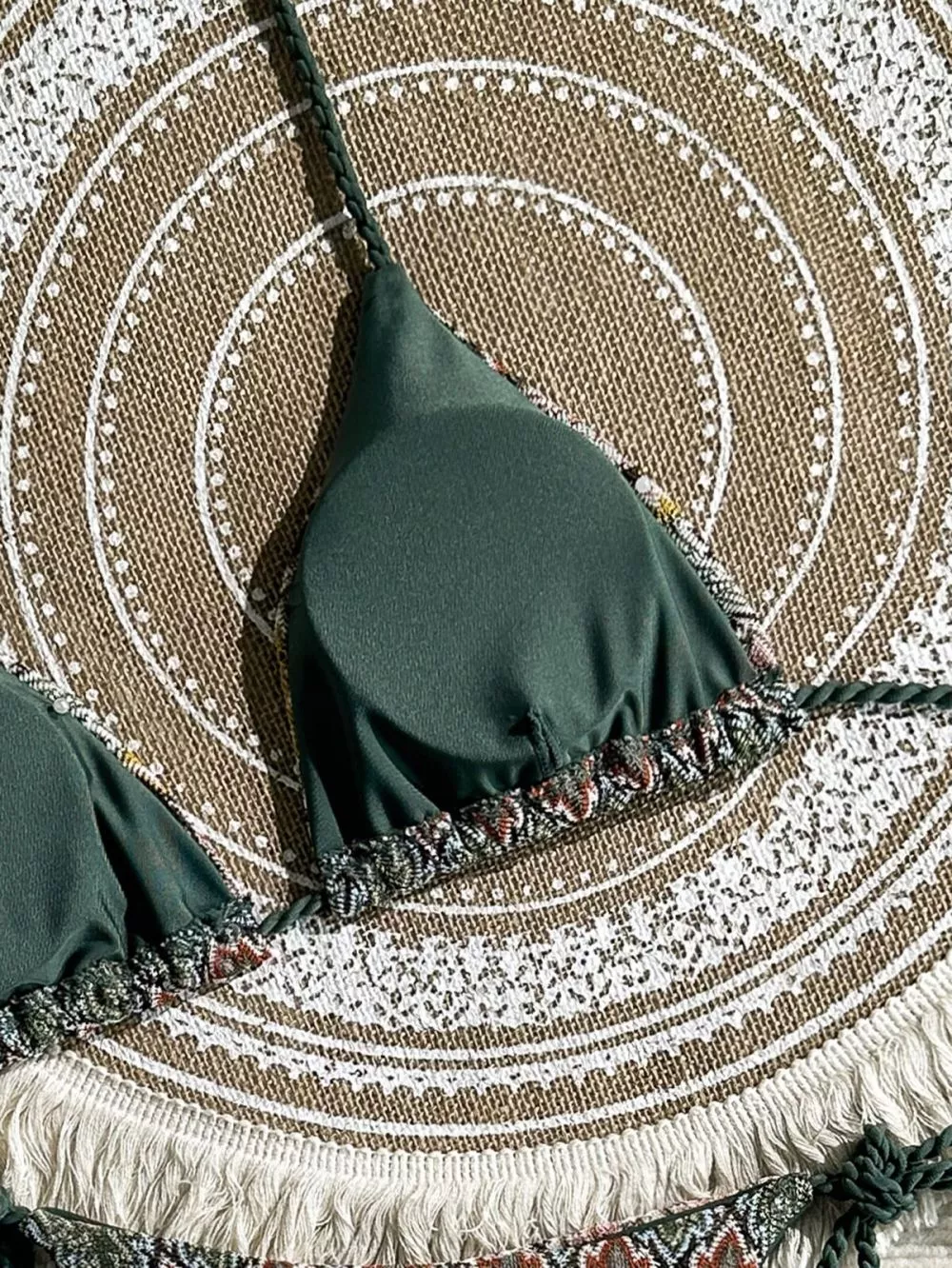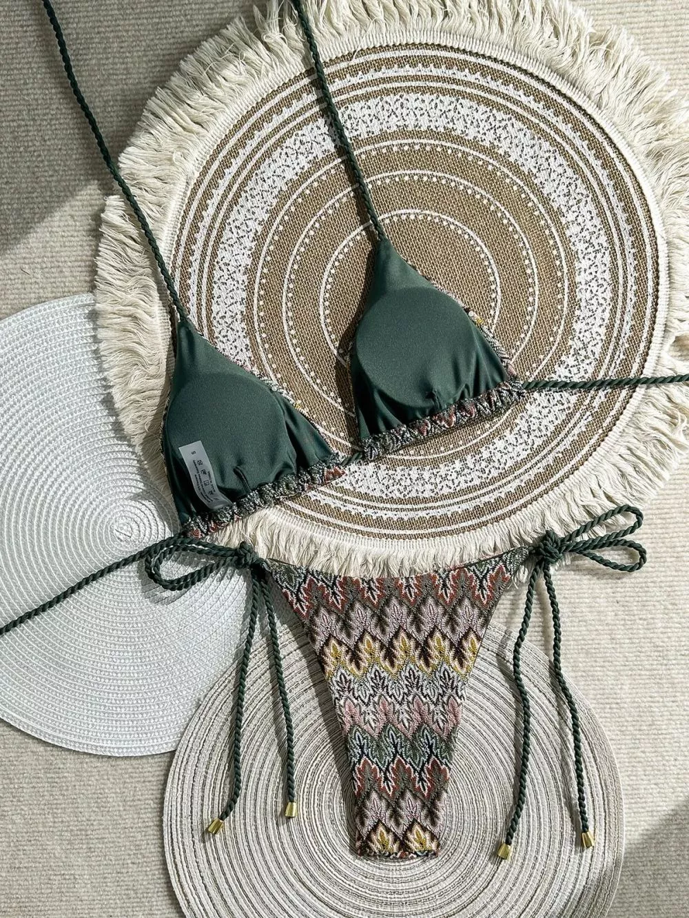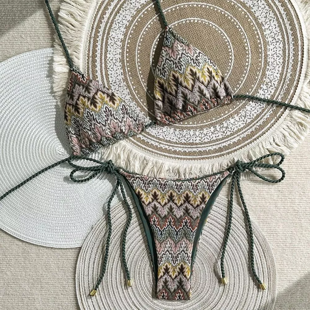 Bikini due pezzi con reggiseno a triangolo e slip con lacci regolabili, caratterizzato da stampa etnica multicolor su base verde oliva. Il design valorizza la silhouette grazie alla linea minimal e ai dettagli intrecciati sui fianchi, perfetto per un look mare deciso, femminile e contemporaneo. Ideale per chi ama uno stile boho chic con carattere.