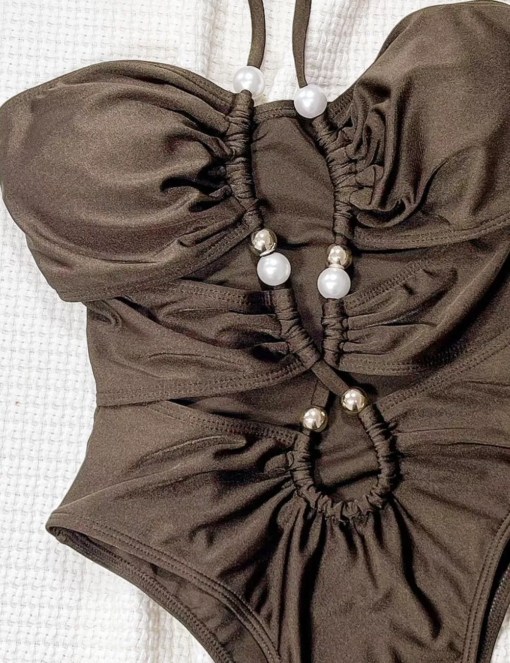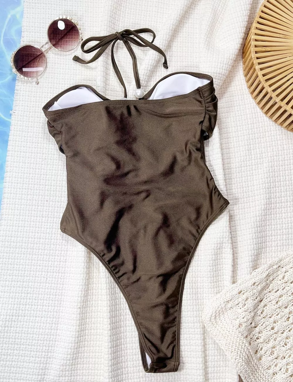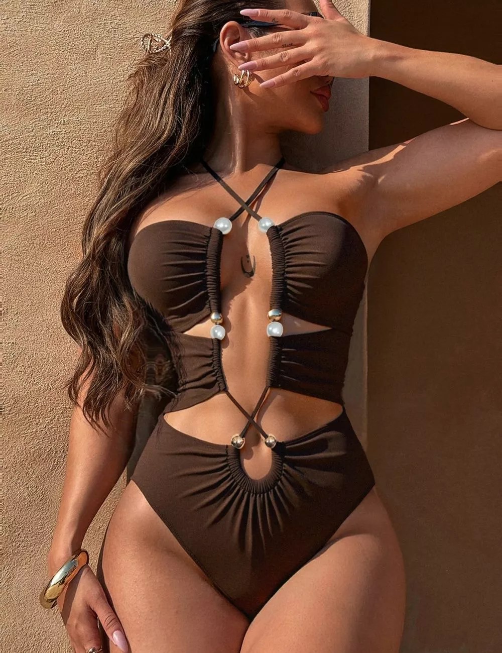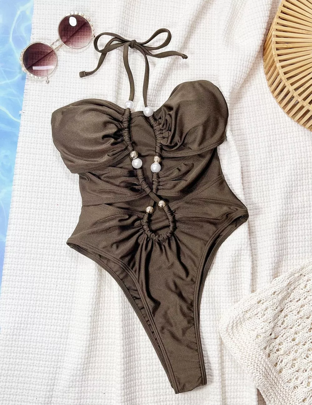 Costume Intero Donna Sensuale Halter Marrone Con Cut Out Perle Centrali CF66091