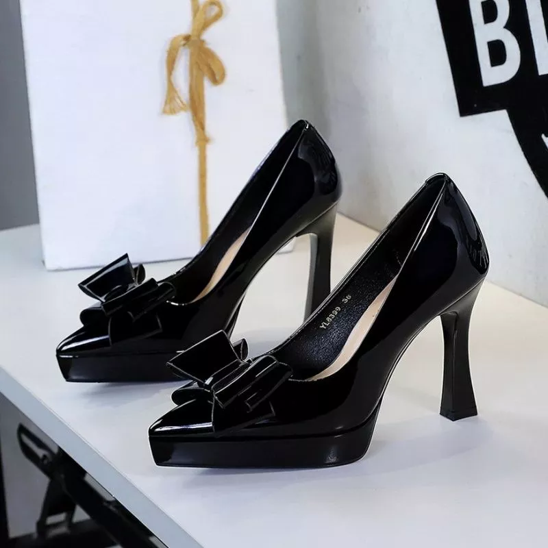 Décolleté Donna Eleganti Nere Con Plateau E Fiocco Tacco Alto 12 Lucide CF65326
