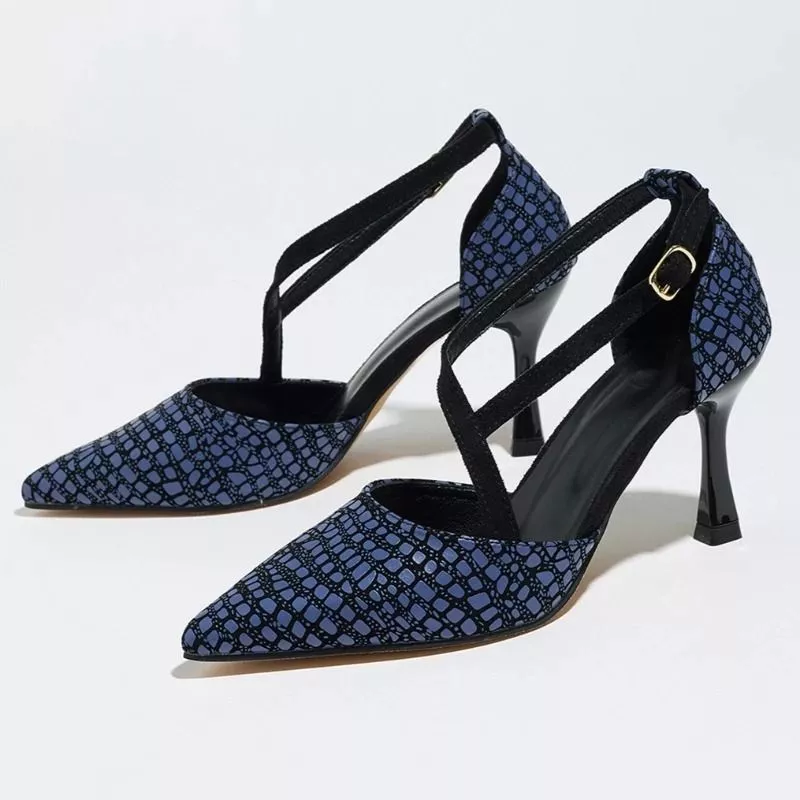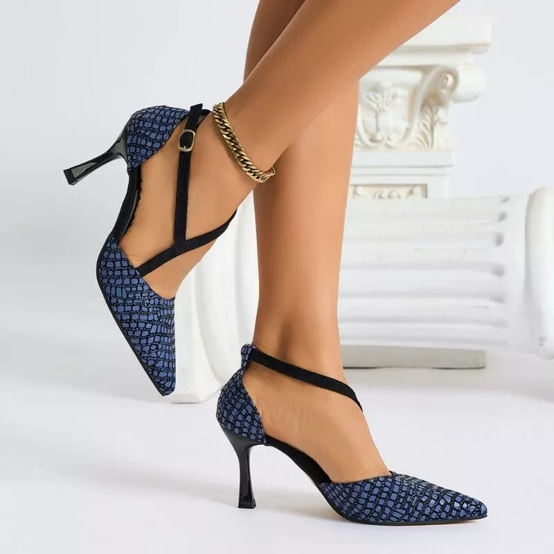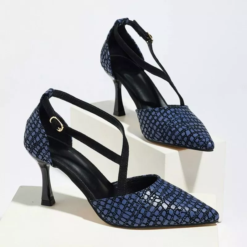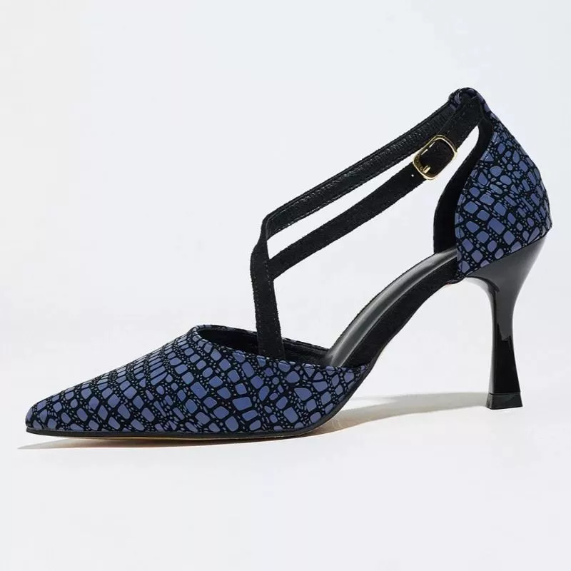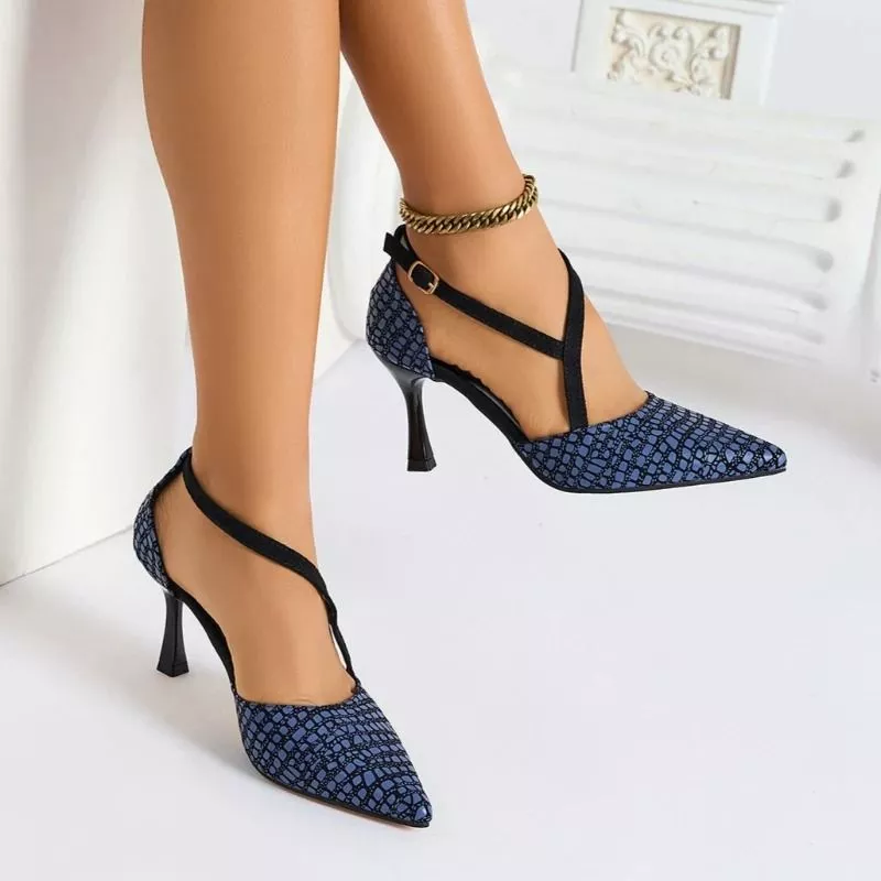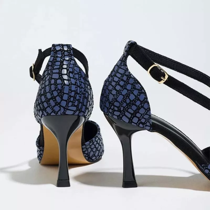 La struttura con cinturino incrociato migliora la stabilità del piede rispetto alle slingback classiche, riducendo lo scivolamento posteriore. La punta affusolata mantiene una linea elegante, mentre il tacco medio sagomato garantisce un compromesso concreto tra estetica e portabilità.