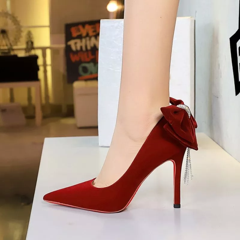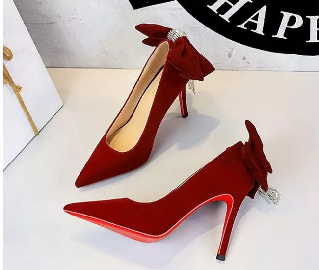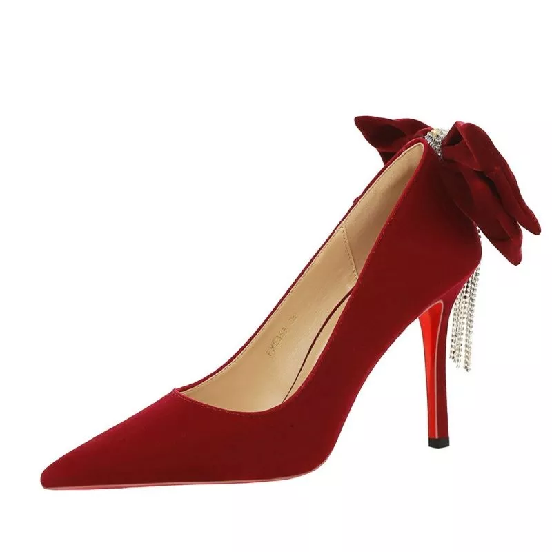 Decollete da donna eleganti dal design raffinato, caratterizzate da una linea slanciata e da un tacco alto che valorizza la figura. Il fiocco decorativo sul retro, impreziosito da applicazioni luminose, aggiunge un dettaglio scenografico e femminile, rendendo il modello ideale per occasioni speciali e serate eleganti.