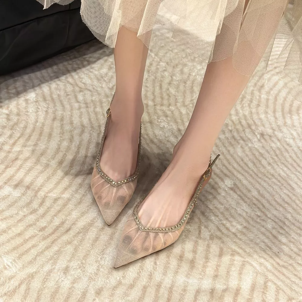 Décolleté eleganti dal design raffinato e contemporaneo, caratterizzate da una silhouette affusolata che slancia visivamente la figura. La tomaia in tulle trasparente crea un effetto leggero e sensuale, impreziosito da profili con strass luminosi che donano brillantezza senza eccessi. Il cinturino slingback assicura stabilità e una calzata più adattiva, mentre il tacco medio garantisce equilibrio tra eleganza e comfort. Perfette per cerimonie, eventi e outfit sofisticati, valorizzano sia look classici che combinazioni più moderne e fashion.