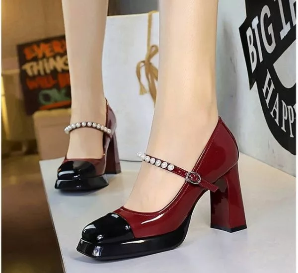 Decolte Donna Rosso Vino Con Cinturino Perle Punta Quadrata Tacco Largo CF62123