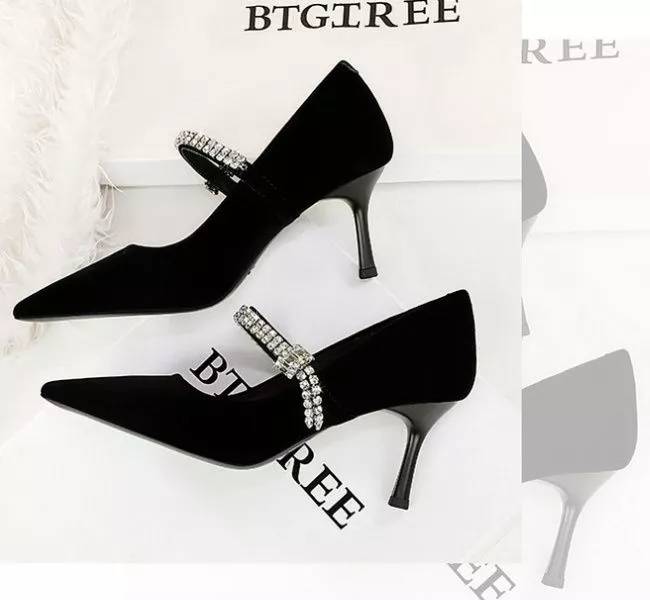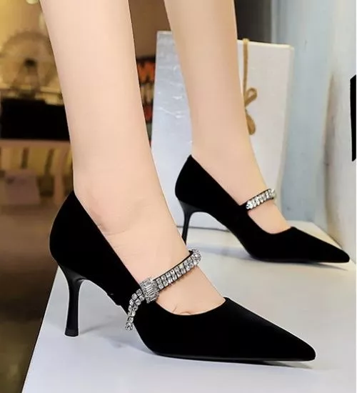 Decolte Nere Tacco 7 Cm Punta Affusolata Con Cinturino Strass Eleganza CF60315