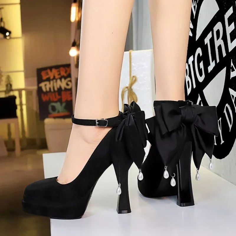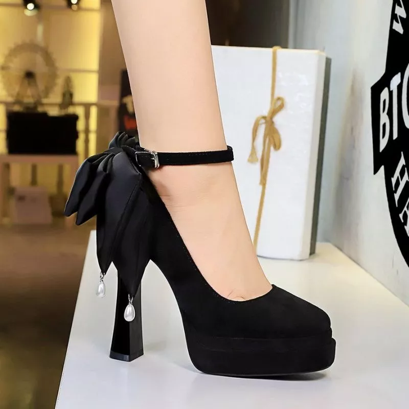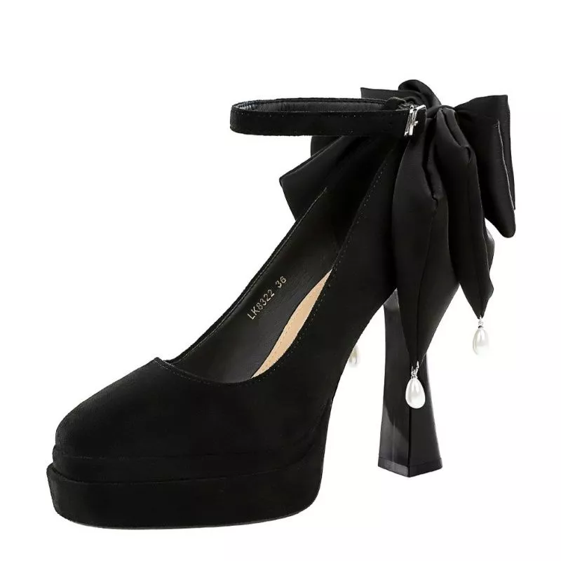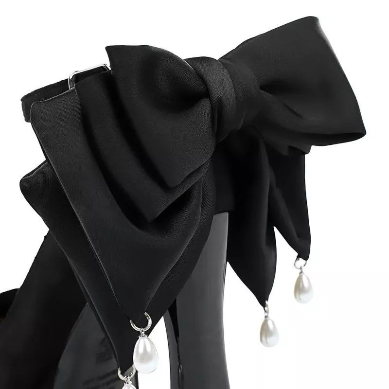 Decolte nere con tacco alto e plateau stabile, progettate per valorizzare la silhouette con un look deciso e scenografico. Il fiocco maxi sul tallone, impreziosito da pendenti effetto perla, aggiunge un tocco ricercato ideale per outfit da serata o eventi speciali.