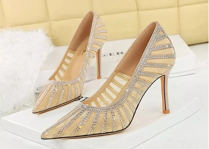 Decolte luminose ed eleganti pensate per valorizzare cerimonie, eventi e look da sera. La struttura in pelle sintetica presenta un raffinato effetto mesh arricchito da strass che creano un gioco di luce sofisticato e femminile.
