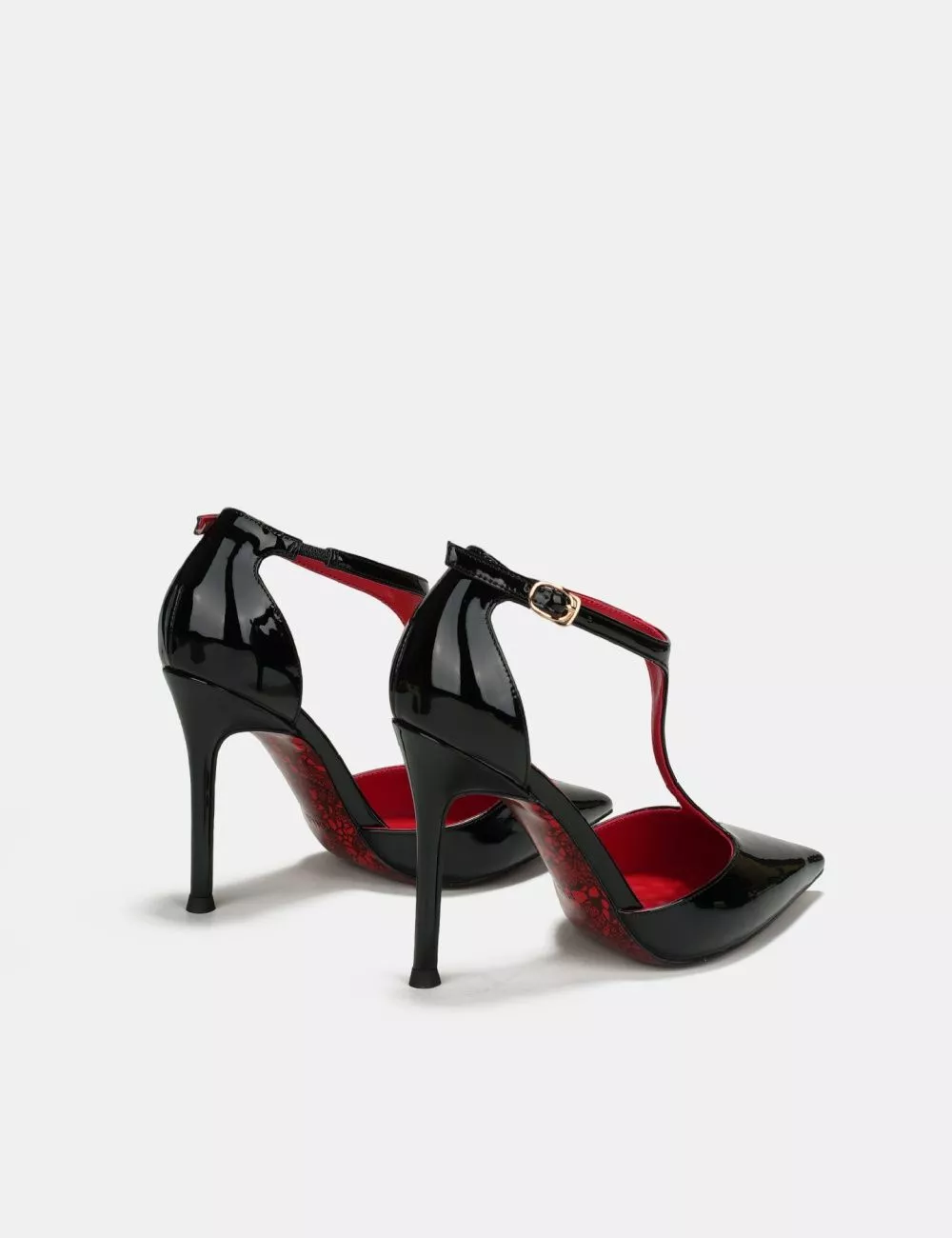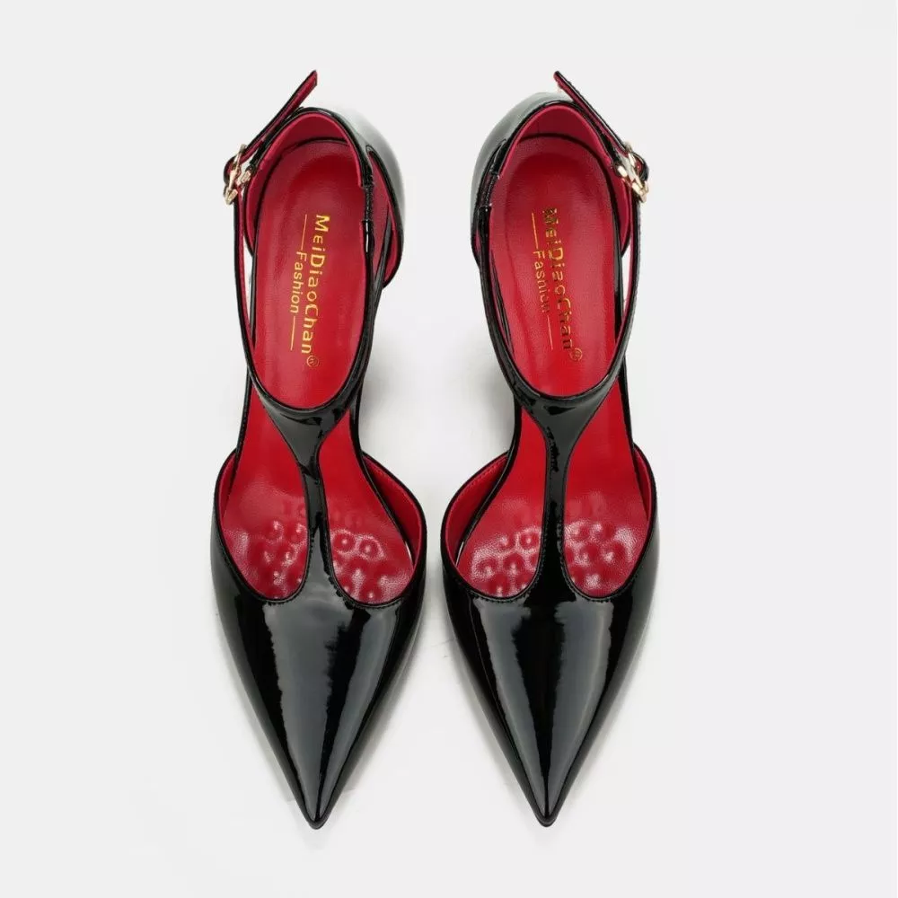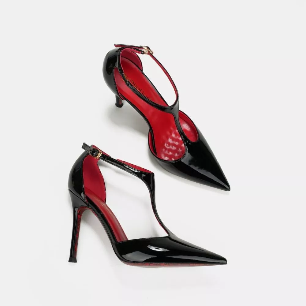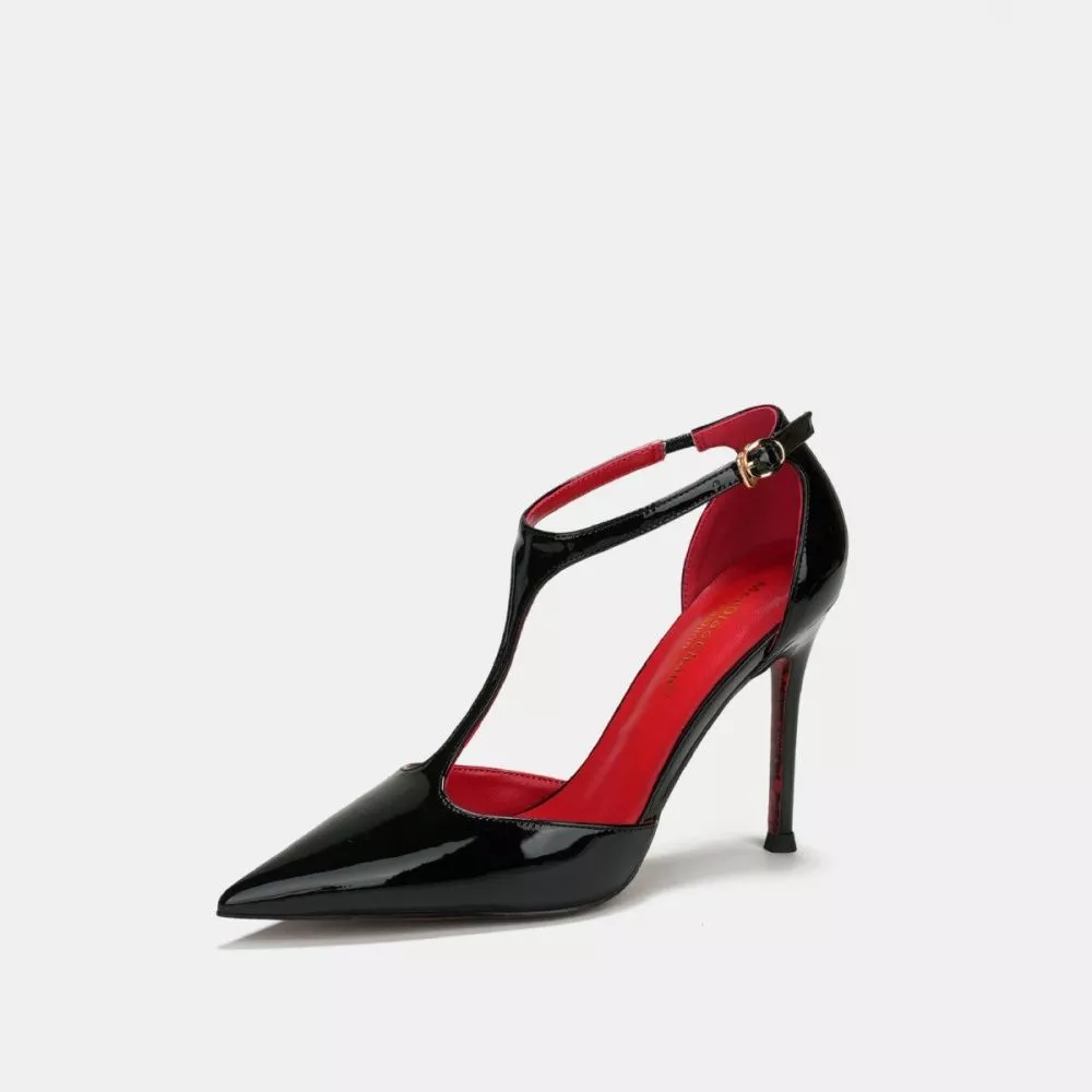 Décolleté T-Bar in vernice dal design deciso e femminile, caratterizzate da punta affusolata e tacco alto da 10 cm che slancia la silhouette. Il cinturino a T valorizza il collo del piede e dona stabilità, creando un effetto raffinato e sensuale.