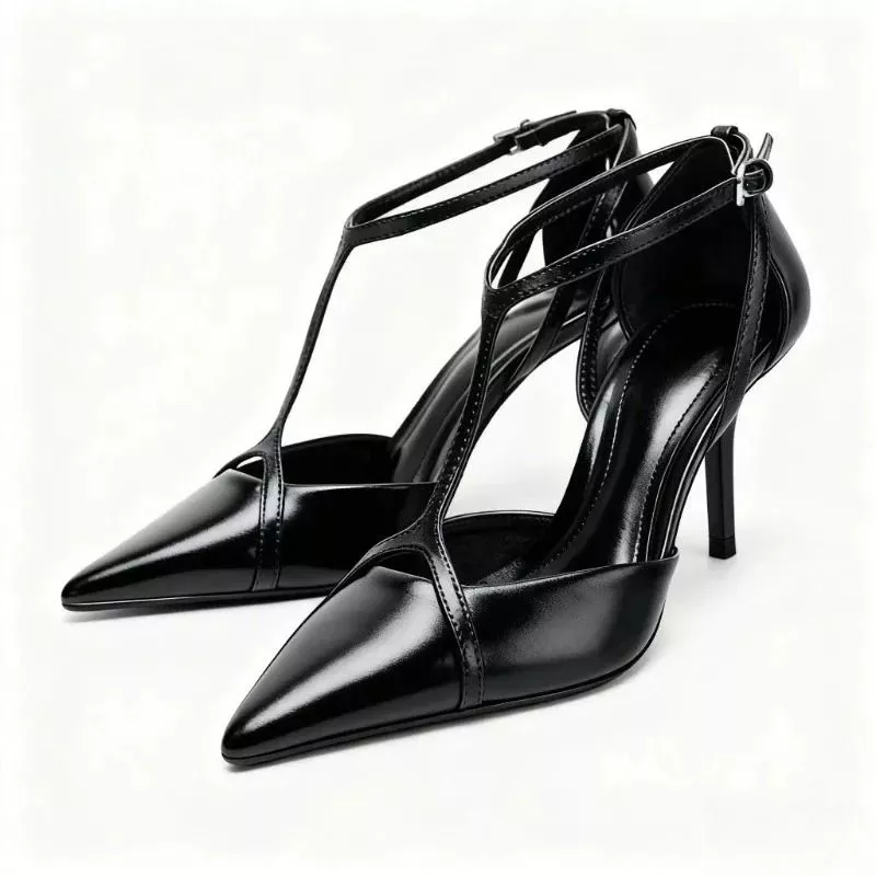 Decolte T-strap da donna dallo stile deciso e contemporaneo, pensate per valorizzare la silhouette con una linea slanciata e femminile. Il design con cinturini sottili incrociati sul collo del piede crea un effetto elegante e distintivo, mentre la punta affusolata dona un aspetto raffinato e moderno. Il tacco alto completa il modello conferendo slancio e presenza, rendendo queste scarpe perfette per chi cerca un look sofisticato senza compromessi.