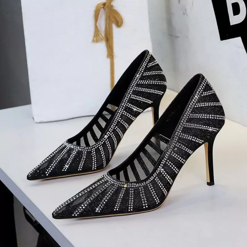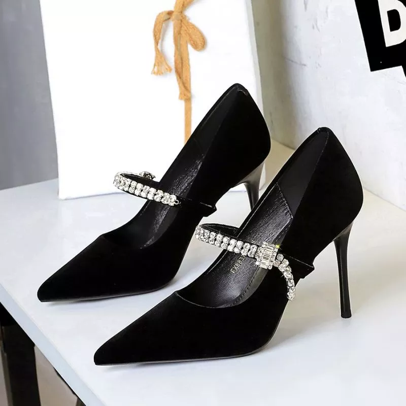Decolte Nere Tacco 9,5 Cm Con Strass Eleganti Donna In Pelle Sintetica CF60324