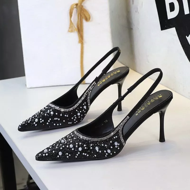 Slingback Nere Tacco 8 Cm Eleganti Con Strass Brillanti Look Donna CF60317