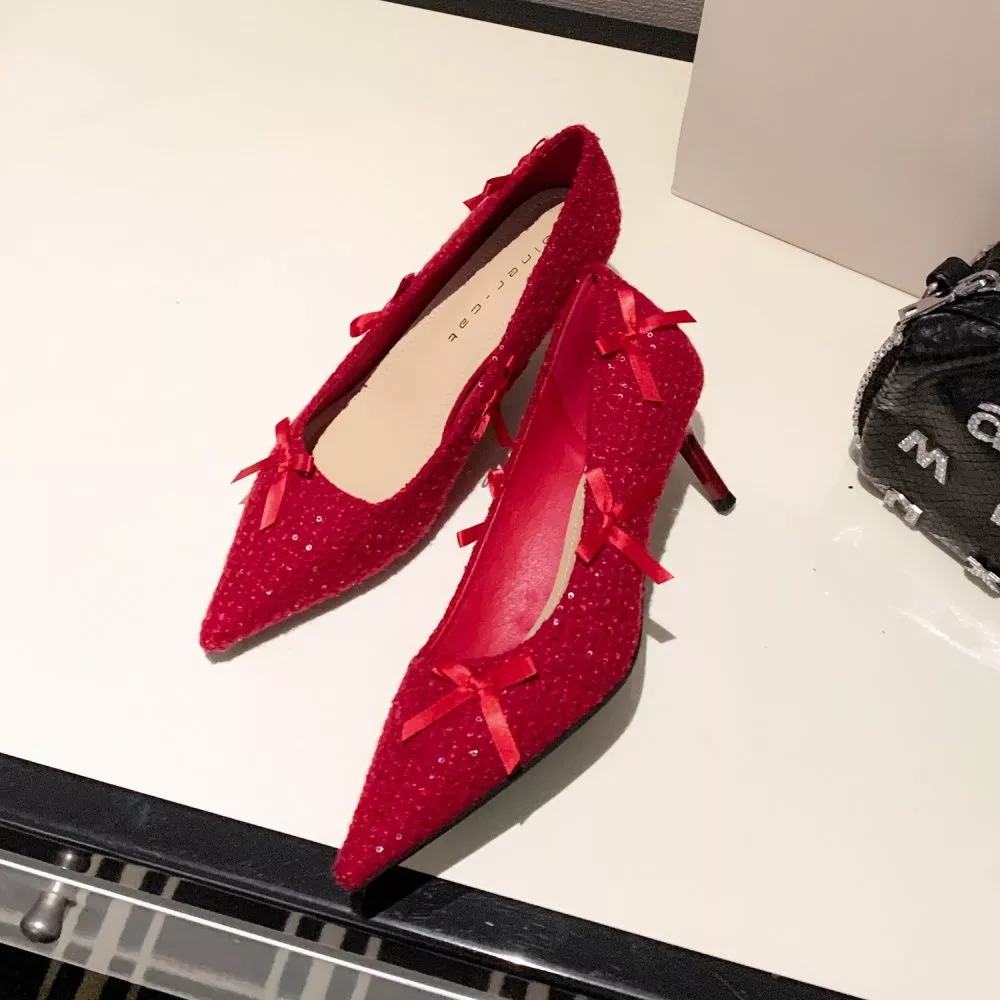 Decolte Donna Eleganti Con Tacco 6 cm A Punta Fiocchi Decorativi Rosso CF66110