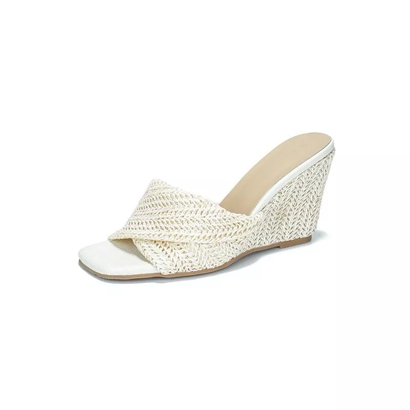 Sabot donna con zeppa rivestita in corda intrecciata dal design estivo e naturale. La fascia ampia incrociata avvolge il piede con stabilità, mentre la zeppa da 8 cm slancia la figura mantenendo comfort e sicurezza nella camminata.