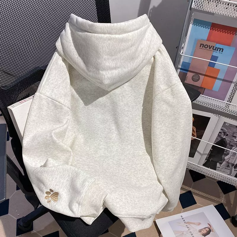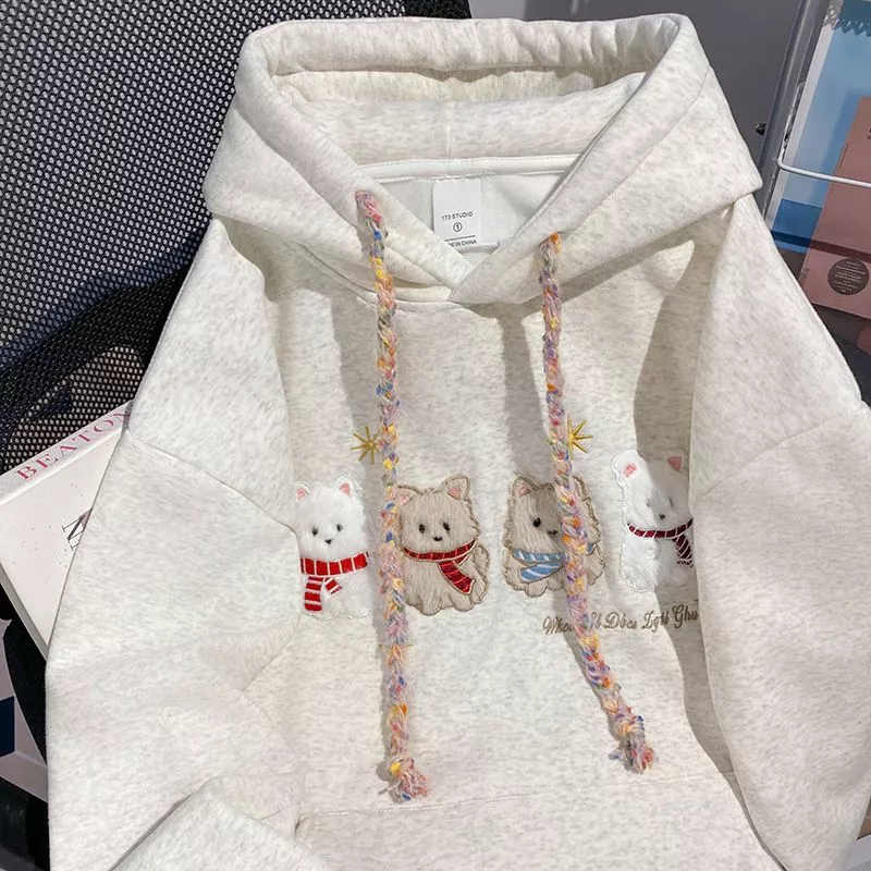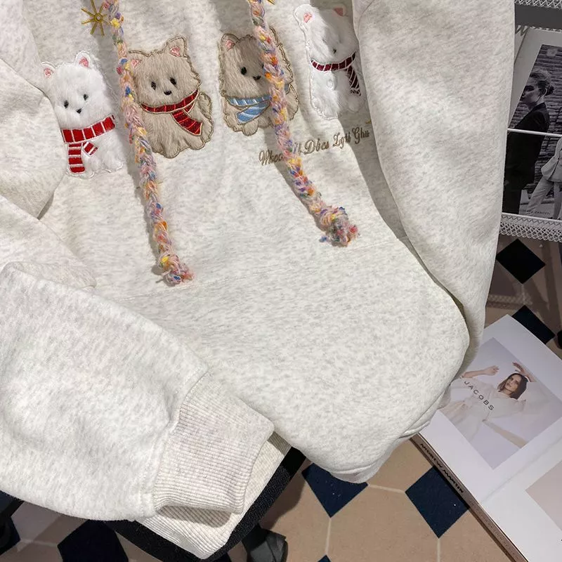 Felpa Avorio Ricamo Animali Calda Morbida Cappuccio Look Casual Donna CF58765