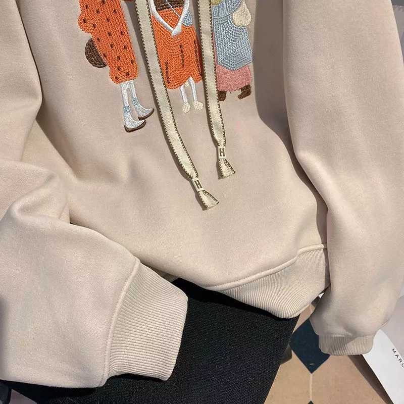 Felpa donna con cappuccio dal design casual e contemporaneo, perfetta per outfit quotidiani comfy e streetwear. Il modello oversize garantisce comfort e vestibilità rilassata, mentre il ricamo frontale con figure stilizzate dona un tocco originale e moderno. Ideale da abbinare a jeans, leggings o pantaloni sportivi per creare look pratici e di tendenza.