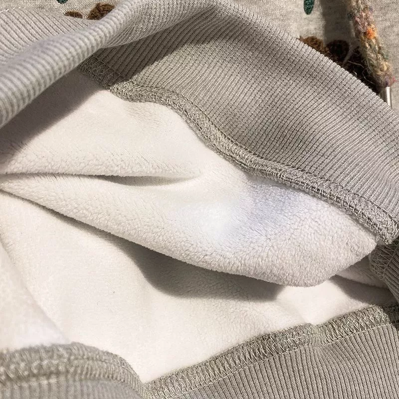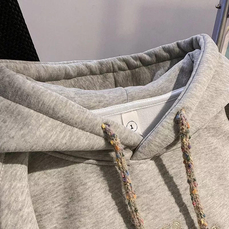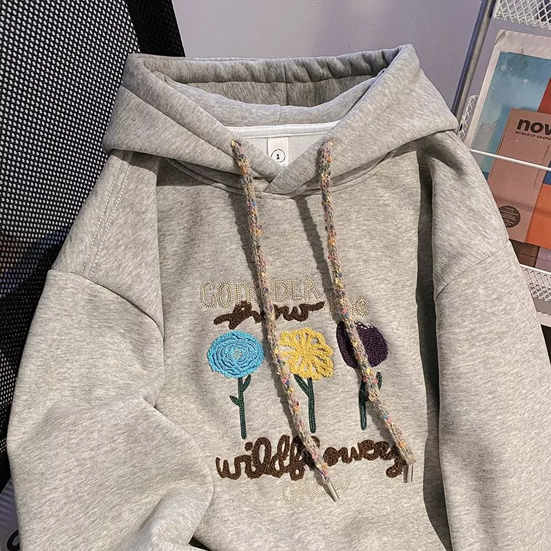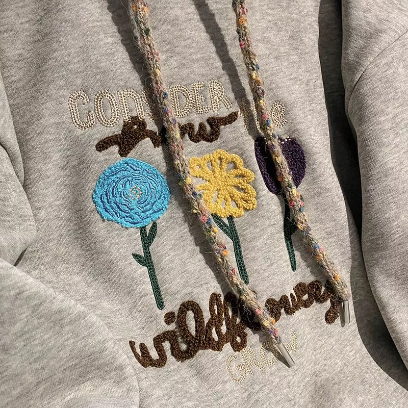 Felpa Donna Grigia Con Cappuccio Ricamo Fiori Casual Oversize CF66409