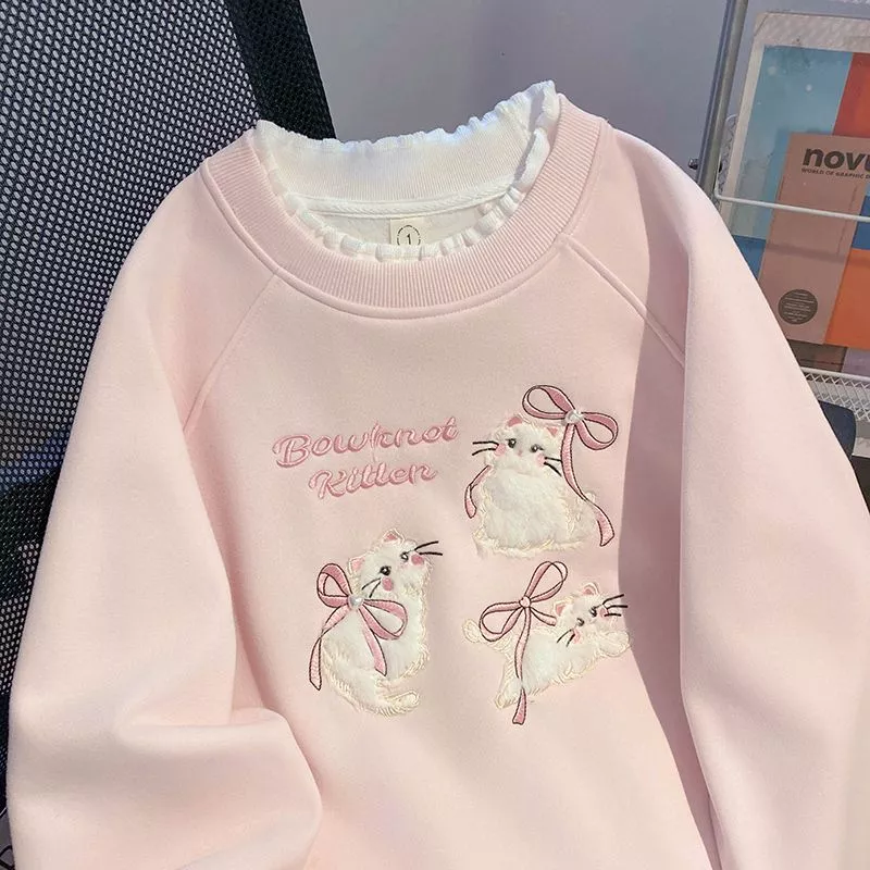 Felpa donna dal design dolce e moderno perfetta per outfit casual e look quotidiani. Il tessuto sintetico morbido con interno felpato assicura comfort e calore mentre il ricamo frontale con gattini e fiocchi dona un tocco femminile e originale. Ideale per creare outfit comfy e di tendenza.