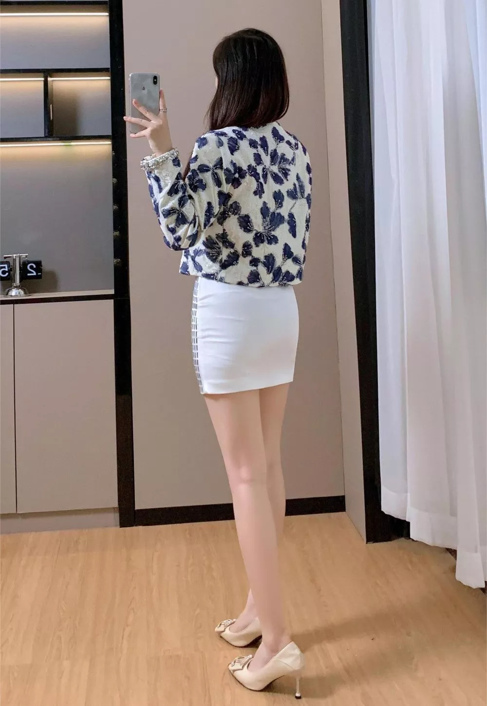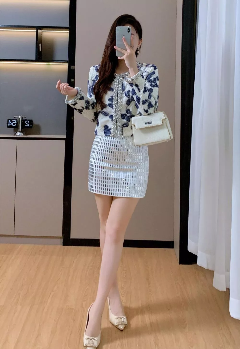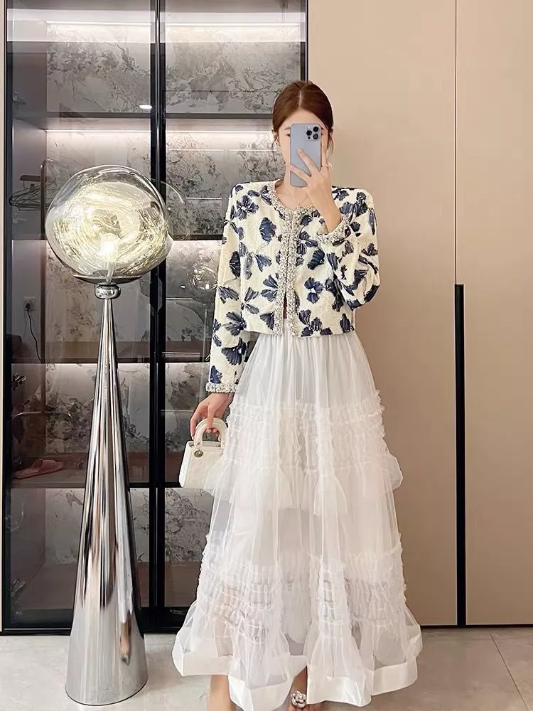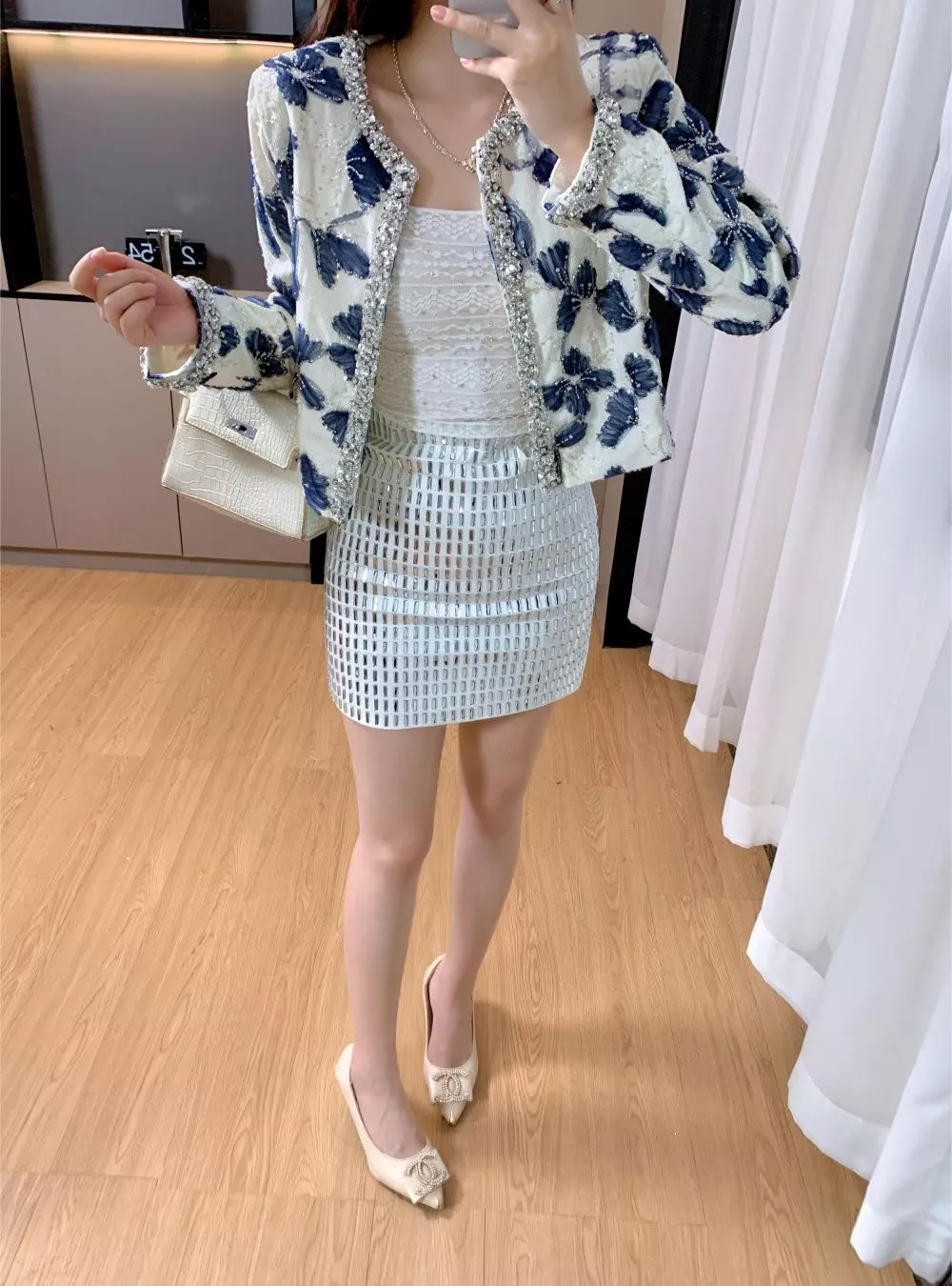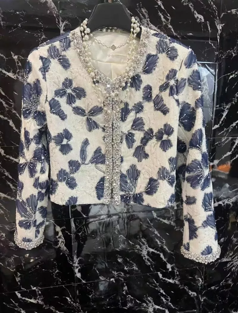 Giacca corta elegante in tessuto strutturato con raffinata lavorazione floreale in rilievo nei toni del bianco e blu. Le rifiniture con perle e cristalli donano luminosità e un tocco di lusso discreto, perfetto per chi cerca un capo elegante ma moderno. Ideale abbinata a gonne o pantaloni a vita alta, è la scelta perfetta per cerimonie, eventi serali o outfit raffinati da sera, in pieno stile contemporaneo.