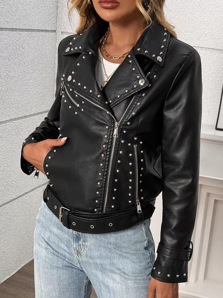 Giacca biker da donna dal design raffinato arricchito da micro borchie distribuite su tutta la superficie, pensate per aggiungere carattere senza risultare eccessive. Realizzata in pelle sintetica con finitura liscia, offre una struttura compatta e una vestibilità slim fit che valorizza la silhouette. La zip asimmetrica e la cintura regolabile richiamano il classico stile biker, mentre i dettagli metallici e le borchie decorative rendono il capo ideale per outfit casual e urbani con un tocco chic. Perfetta per un utilizzo quotidiano con personalità.