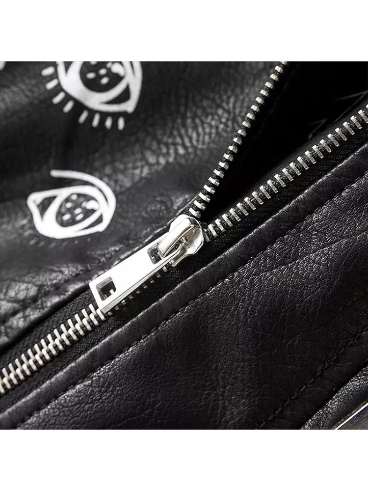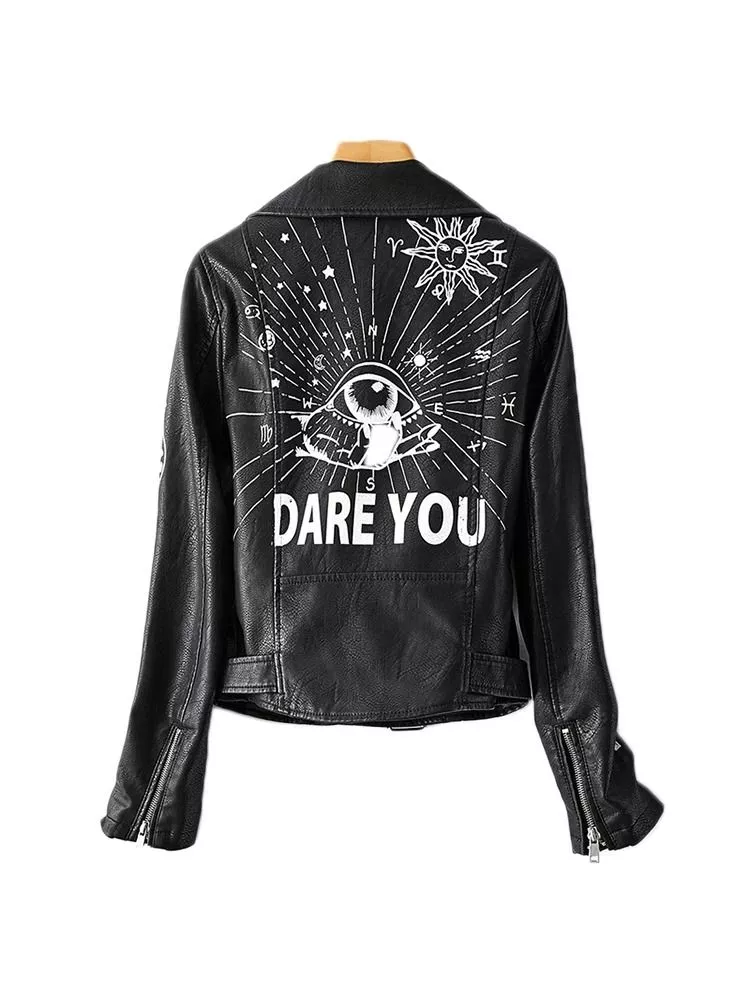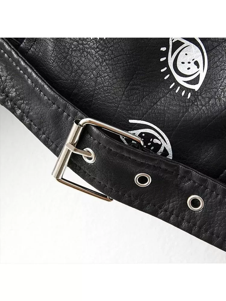 Giacca biker da donna caratterizzata da un design distintivo con stampa grafica e scritte decorative che donano al capo un forte carattere streetwear. Realizzata in pelle sintetica con finitura leggermente strutturata, presenta una vestibilità slim fit che segue la linea del corpo valorizzando la silhouette. La zip asimmetrica e la cintura regolabile richiamano il classico stile biker, mentre i dettagli stampati e gli inserti grafici rendono il capo moderno e riconoscibile. Perfetta per outfit urbani e look casual con personalità.