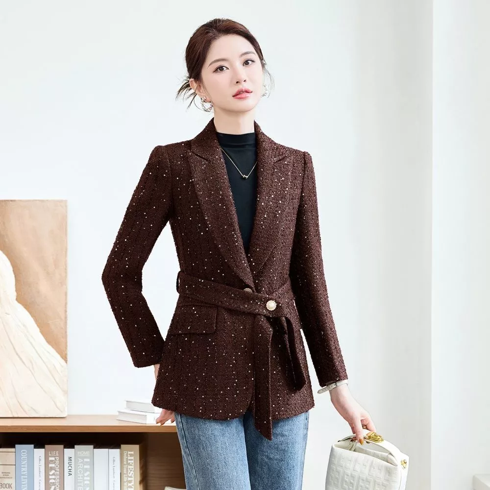 Giacca Donna Marrone Elegante Con Cintura Blazer Da Ufficio Tweed CF61643