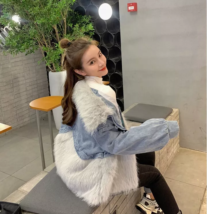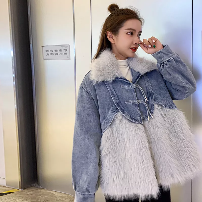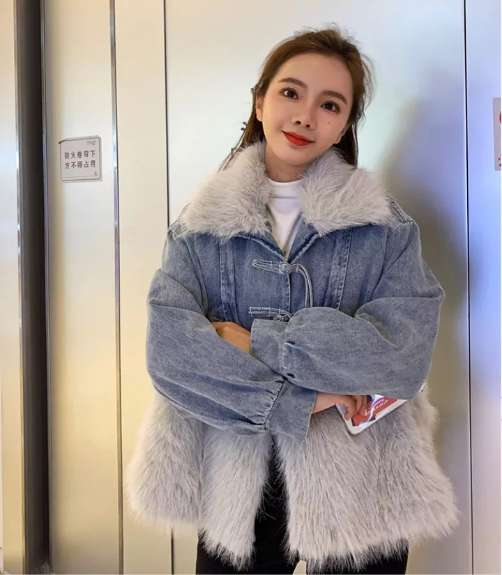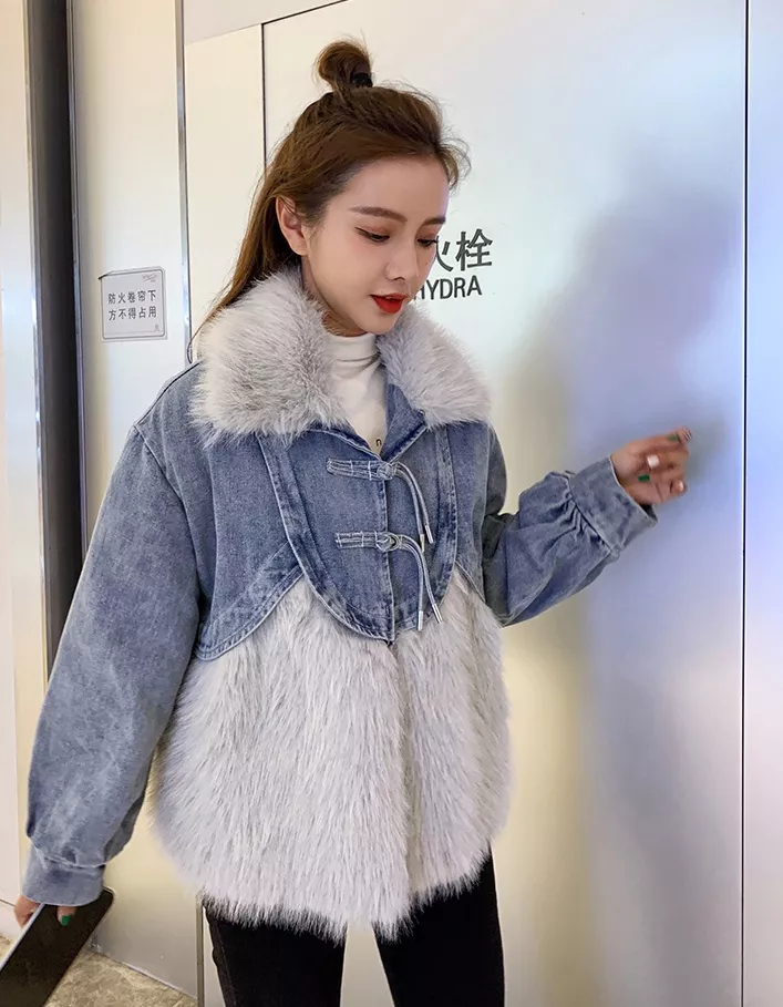 Giacca Cappotto Pelliccia Donna Ecologica Sintetica Denim Jeans Grigio 46002