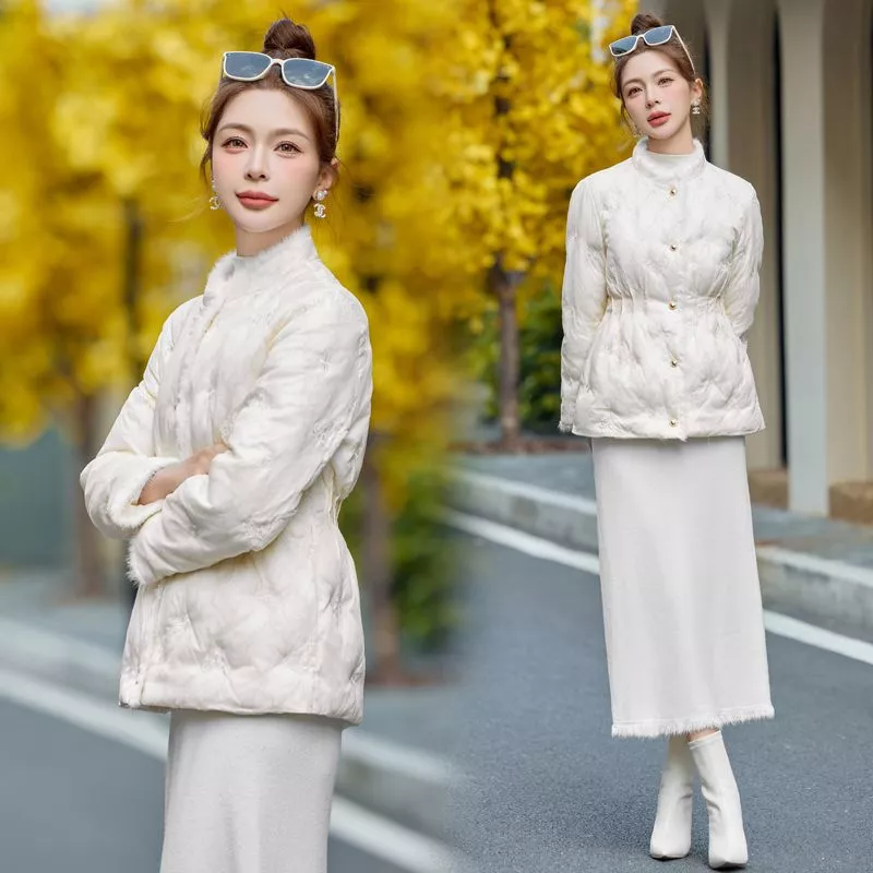 Giacca corta imbottita da donna dal design elegante e femminile, caratterizzata da una vita regolabile con cintura che valorizza la silhouette. Il modello presenta collo alto strutturato, chiusura frontale con bottoni decorativi e una lavorazione superficiale raffinata che dona profondità al capo. Ideale per completare outfit invernali curati, si abbina facilmente a gonne midi, pantaloni o abiti aderenti per un look ordinato e sofisticato.