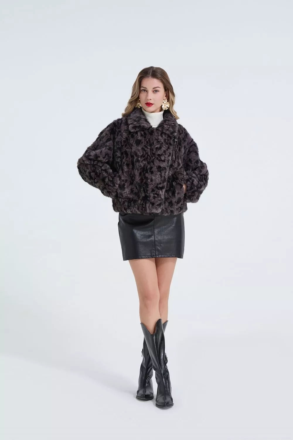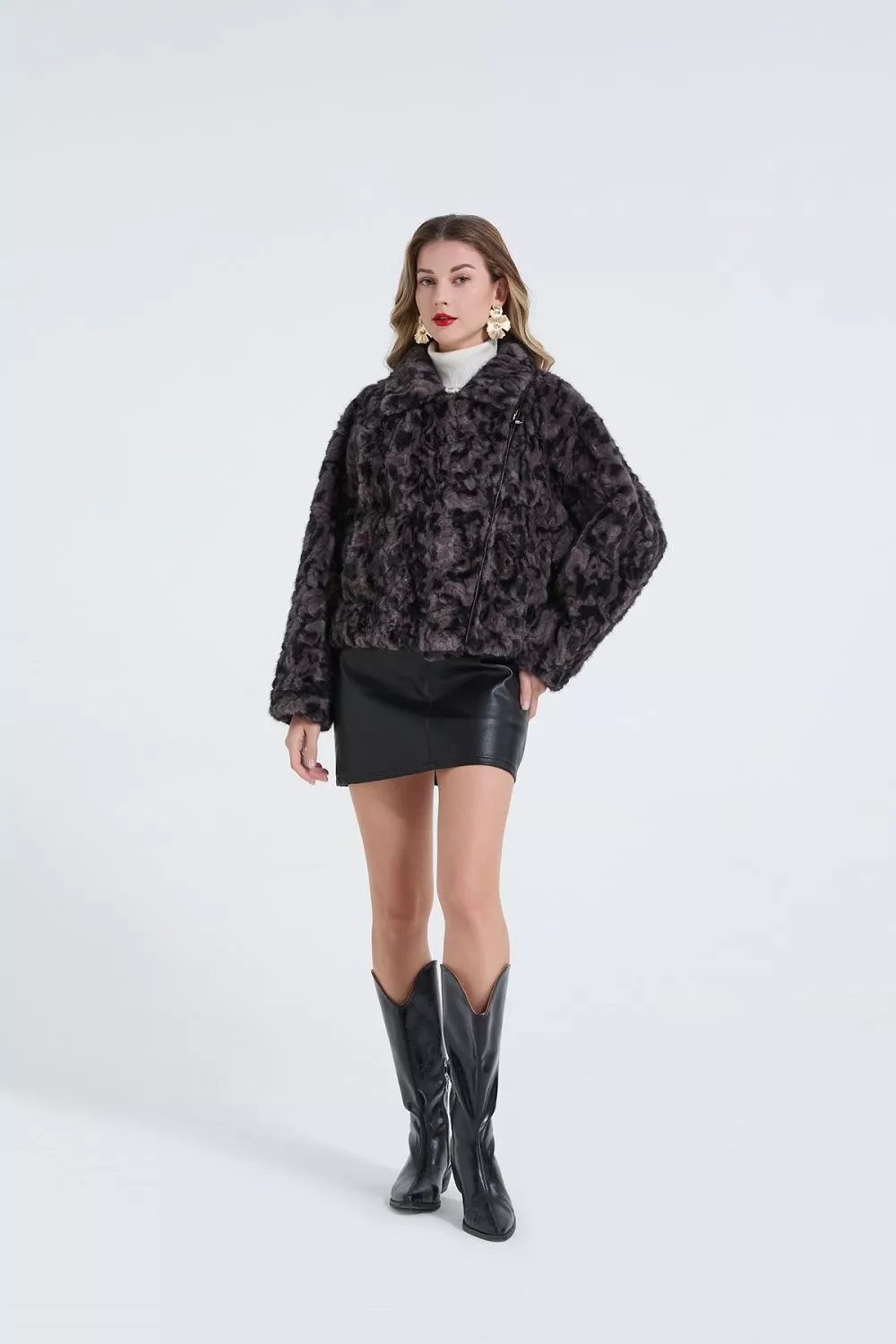 Giacca corta donna effetto pelliccia sintetica dal carattere deciso, definita da una fantasia maculata e da chiusura con zip asimmetrica che valorizza il design contemporaneo. Il taglio corto enfatizza la linea del corpo e rende il capo ideale per look urbani, serali o da aperitivo. Un outerwear compatto ma d'impatto, pensato per chi cerca stile e personalità in un capo versatile.
