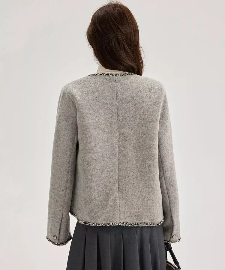 Giacca corta grigia in tessuto effetto lana sintetica, dal taglio dritto e raffinato.