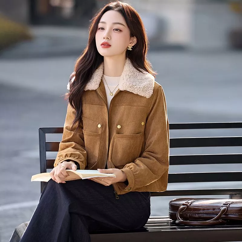 Giacca Donna Corta Marrone Invernale Con Collo In Teddy Imbottita CF64362